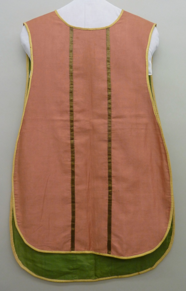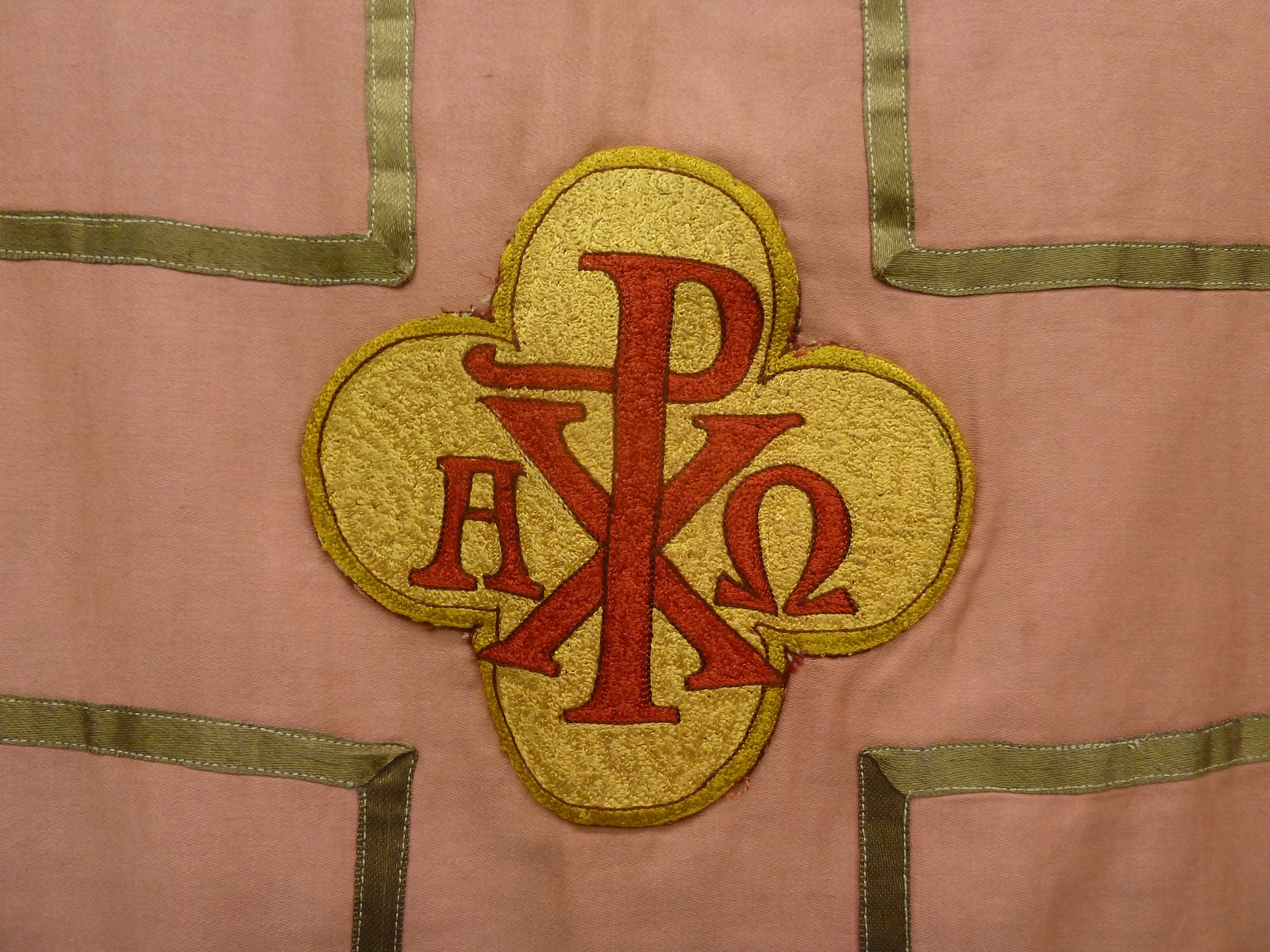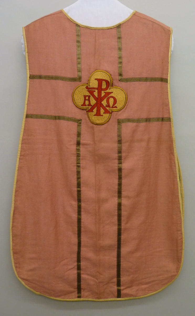 Roze kinderkazuifel met kruis van goudgalon waarin vierpas met Alfa, Omega en Christusmonogram