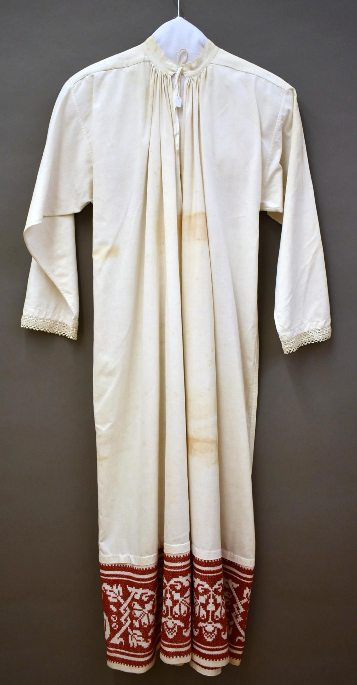 Witte kinderalbe met aan de onderkant een rode geborduurde band