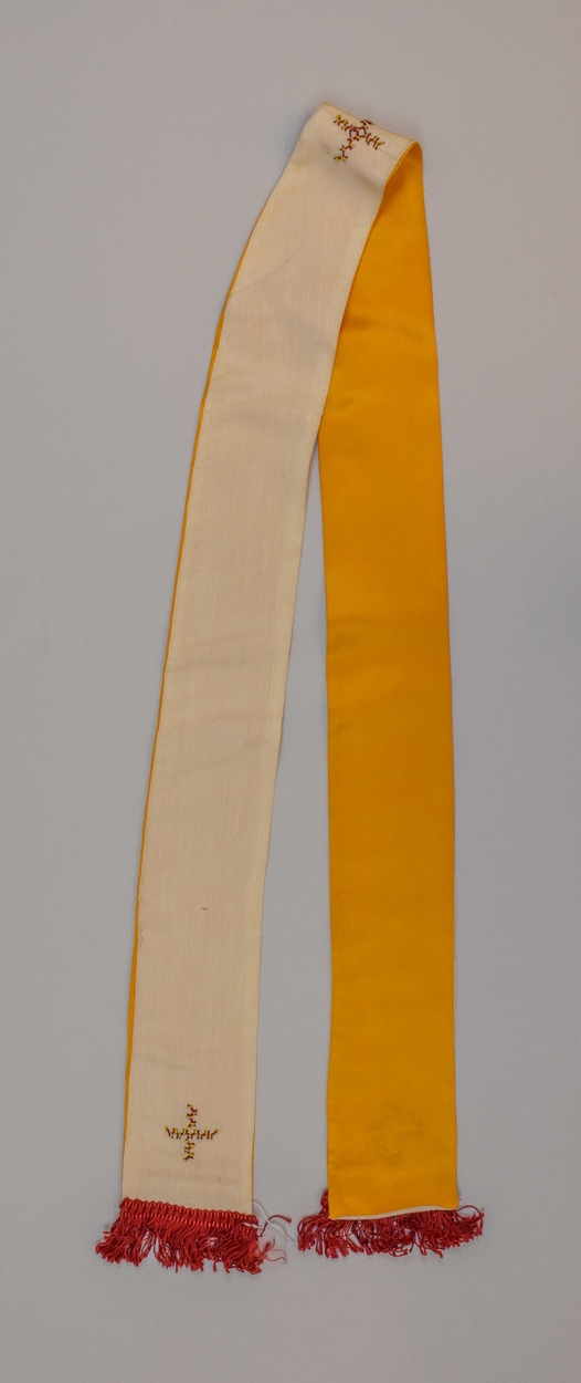 Witte kinderstola met geel-rode kruisjes en rode franje