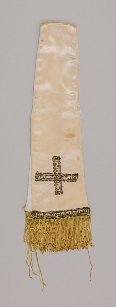 Witte kindermanipel met kruisje van gouddraad en beige franje