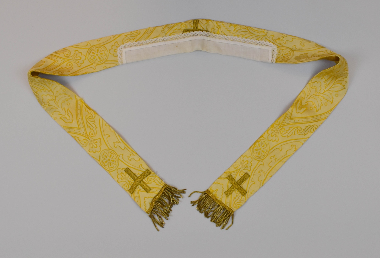 Gele kinderstola met kruisjes van goudgalon en franje van gouddraad en wit kraagje