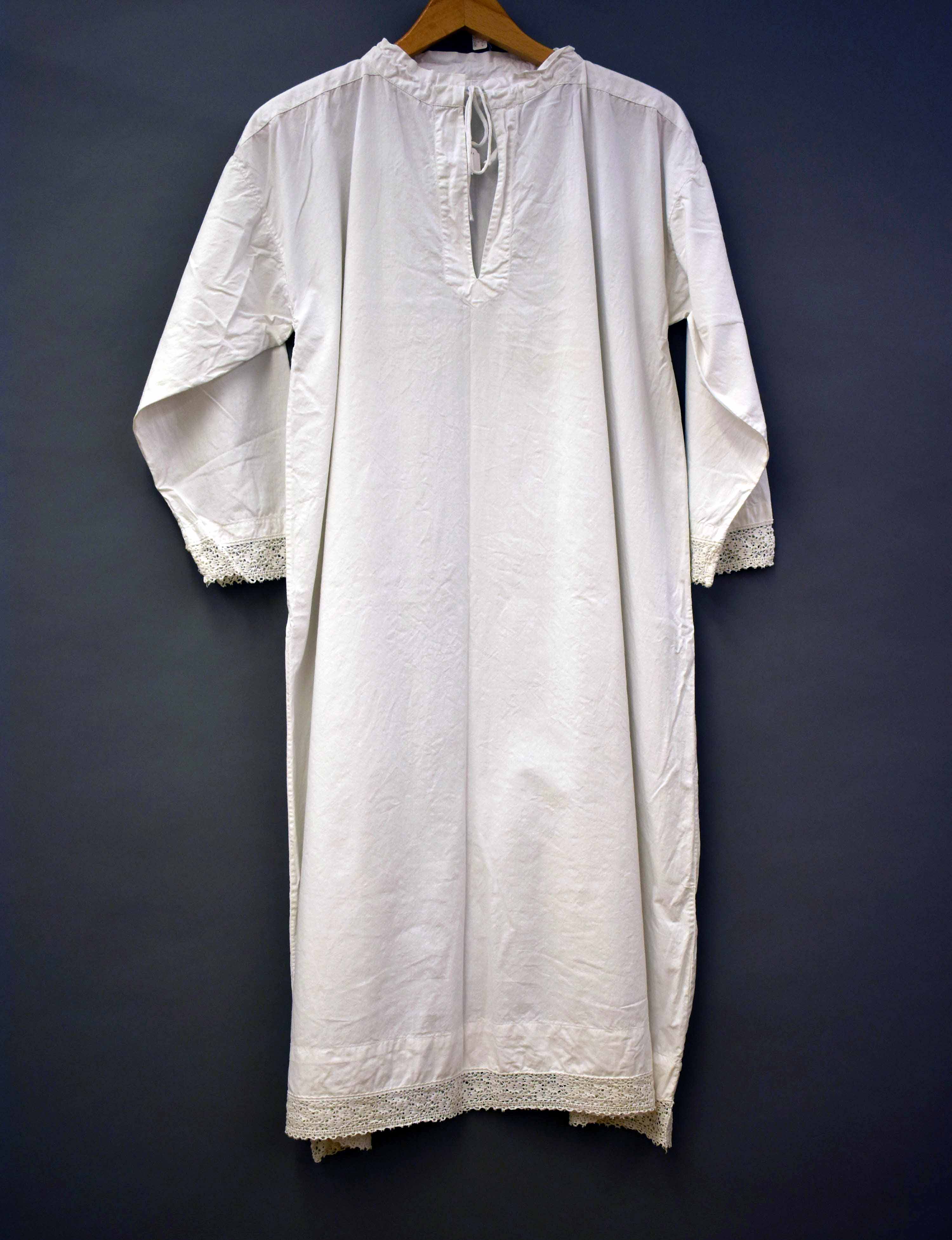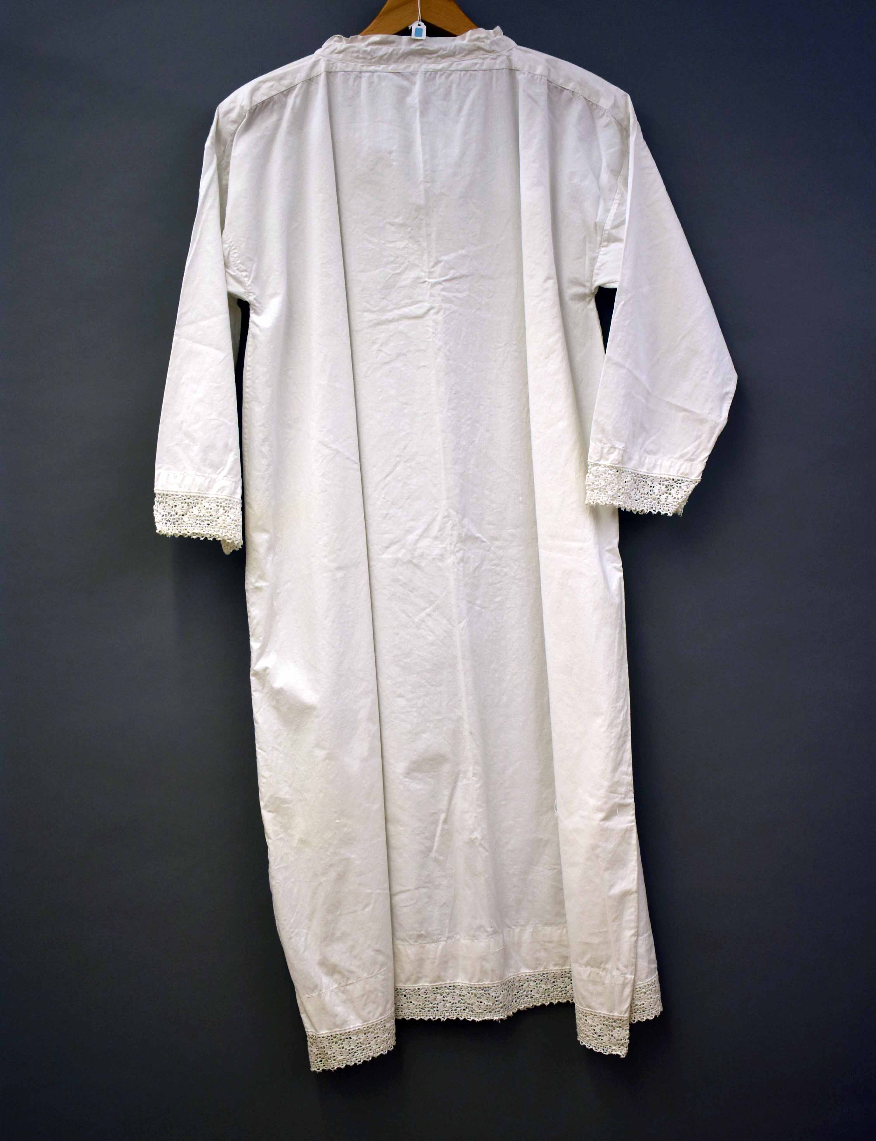 Kinderalbe met stroken gehaakte kant aan mouwen en onderkant
