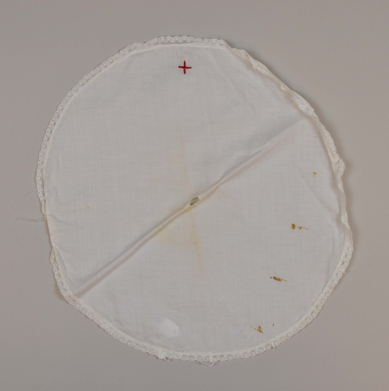Wit speelgoedciboriekleed met kanten rand en rood kruisje