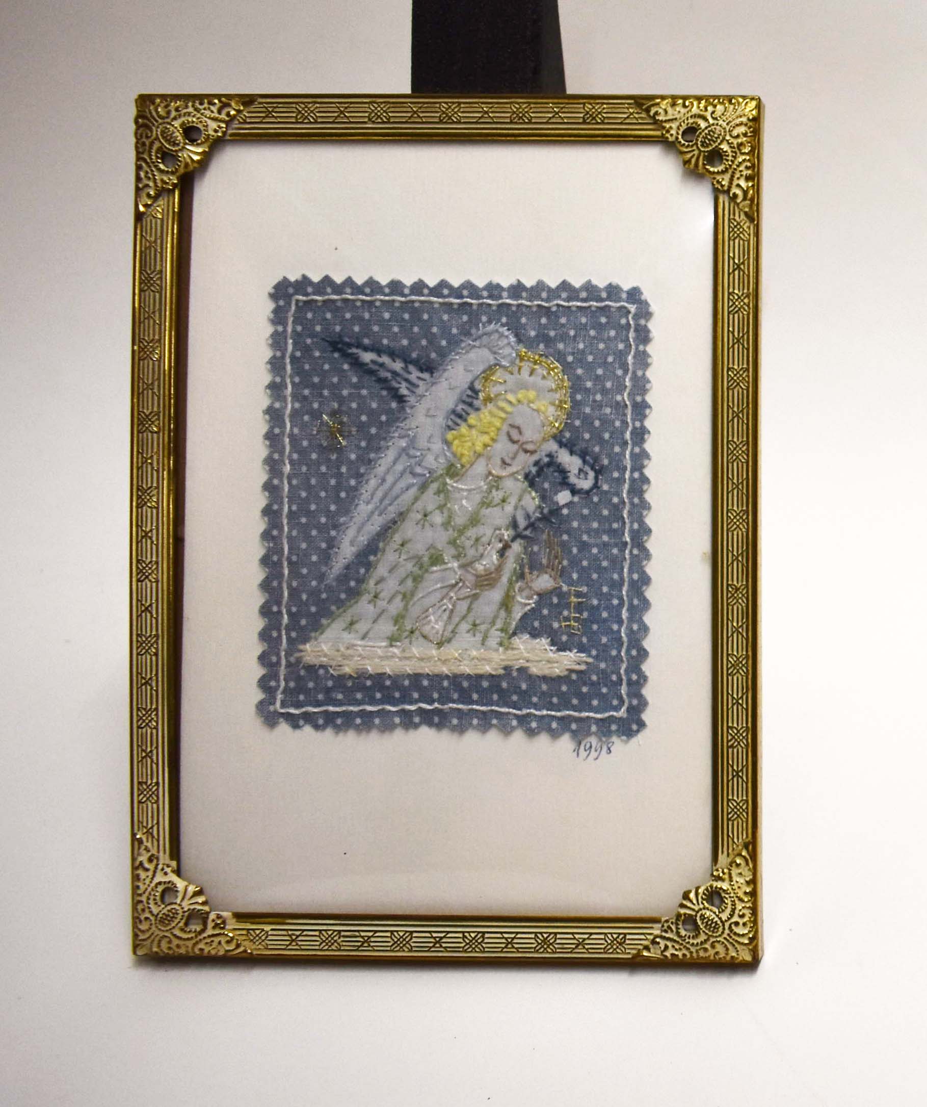 Geborduurde engel met witte vredesduif in rechterhand, bij kerstkaart