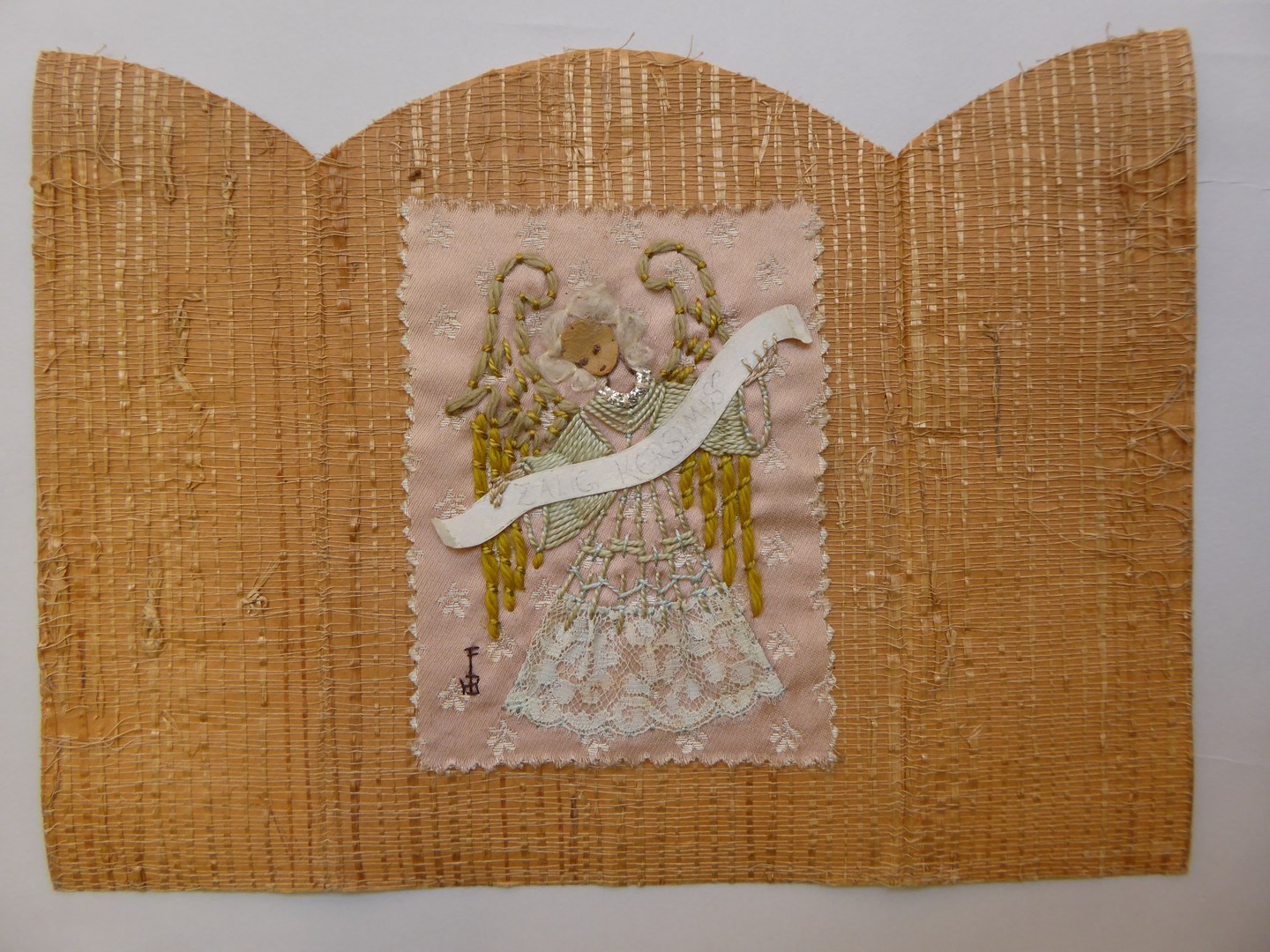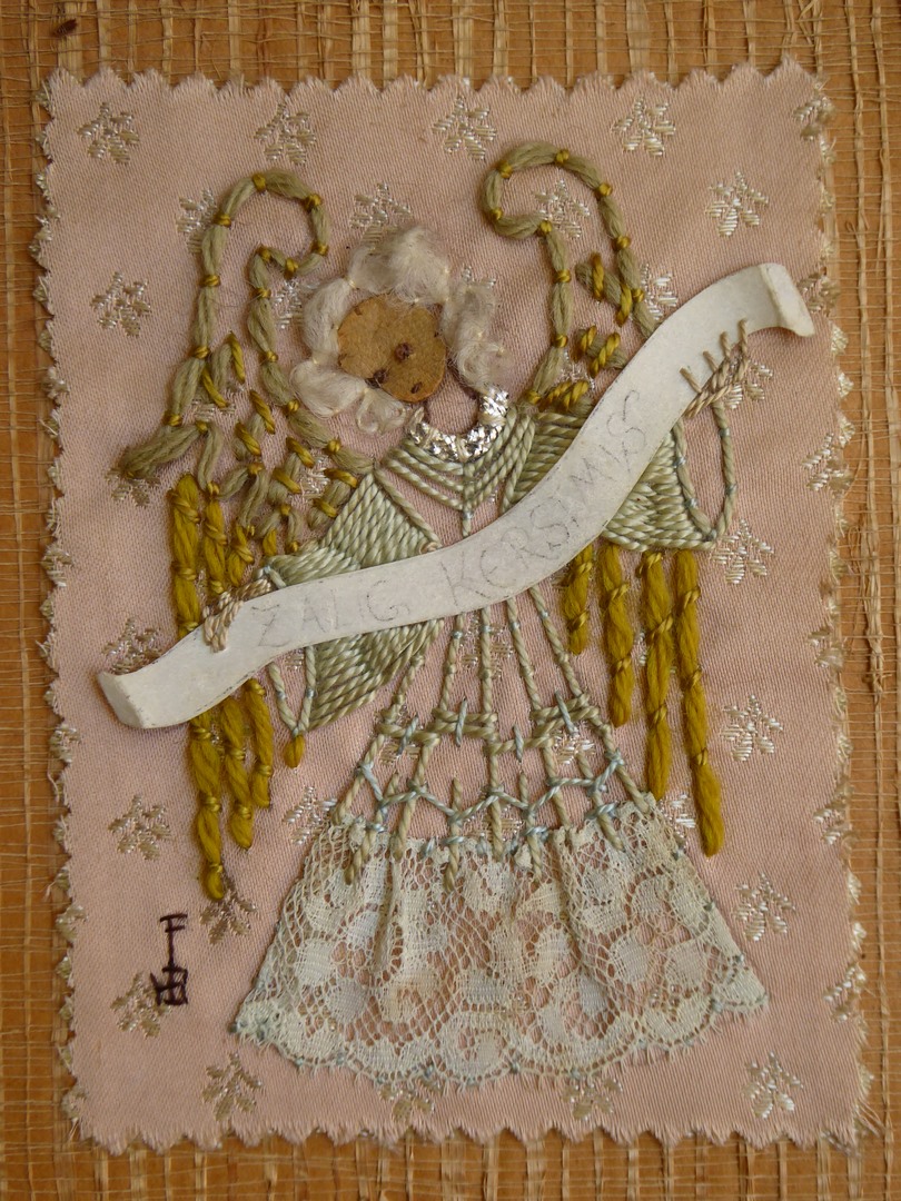 Kerstkaart met geborduurde engel met banderol met "Zalig kerstmis"