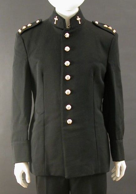 Ceremonieel tenue Dienst Protestantse Geestelijke Verzorging Koninklijke Landmacht van ds. J.W. Schneider: zwarte jas met rangonderscheidingstekens op schouders en embleem van PGV op kraag