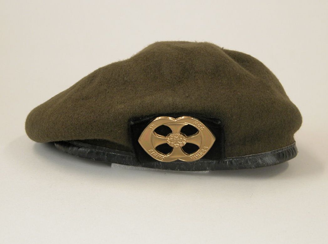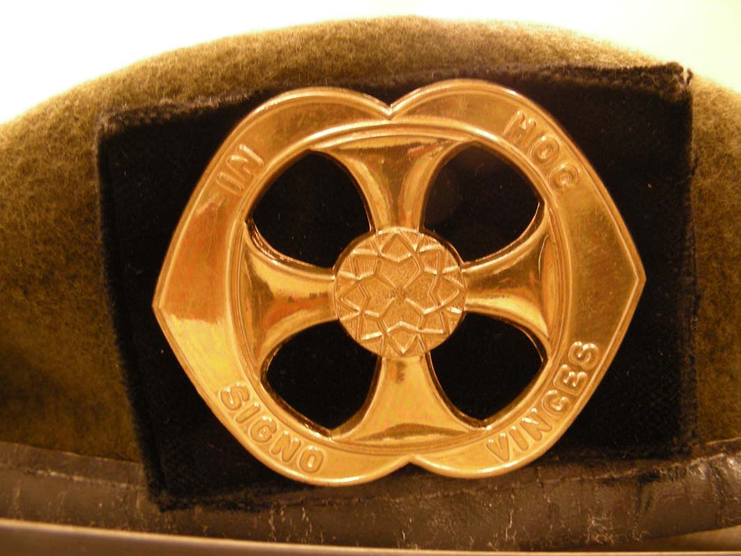 Dagelijks tenue Dienst Protestantse Geestelijke Verzorging Koninklijke Landmacht van ds. J.W. Schneider: groene baret met embleem PGV met "In hoc signo vinces"