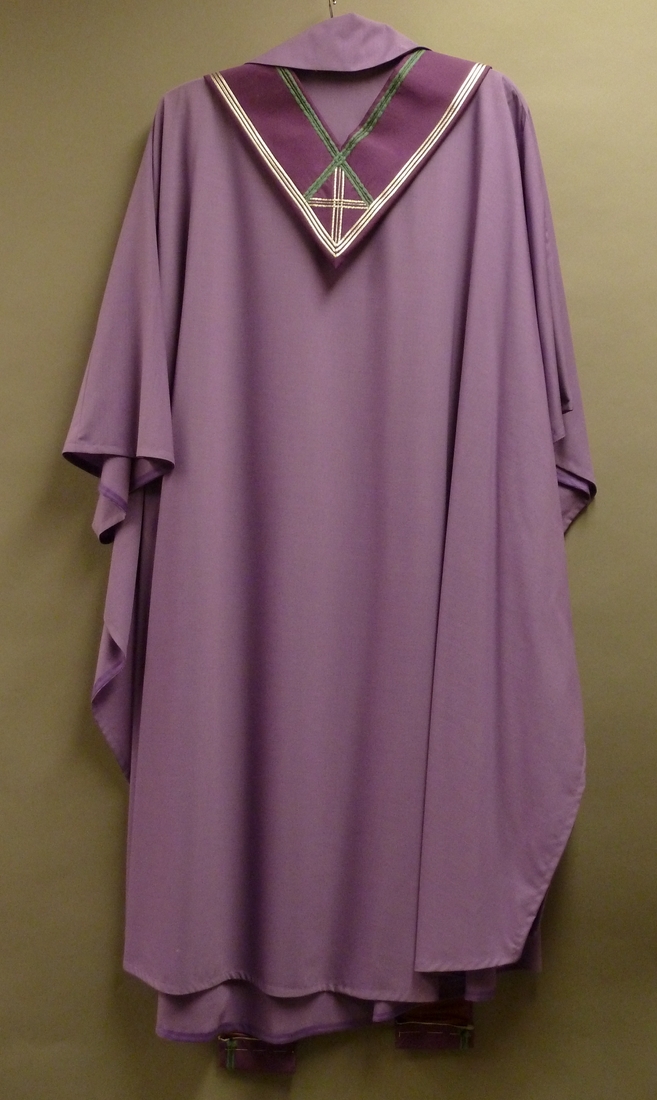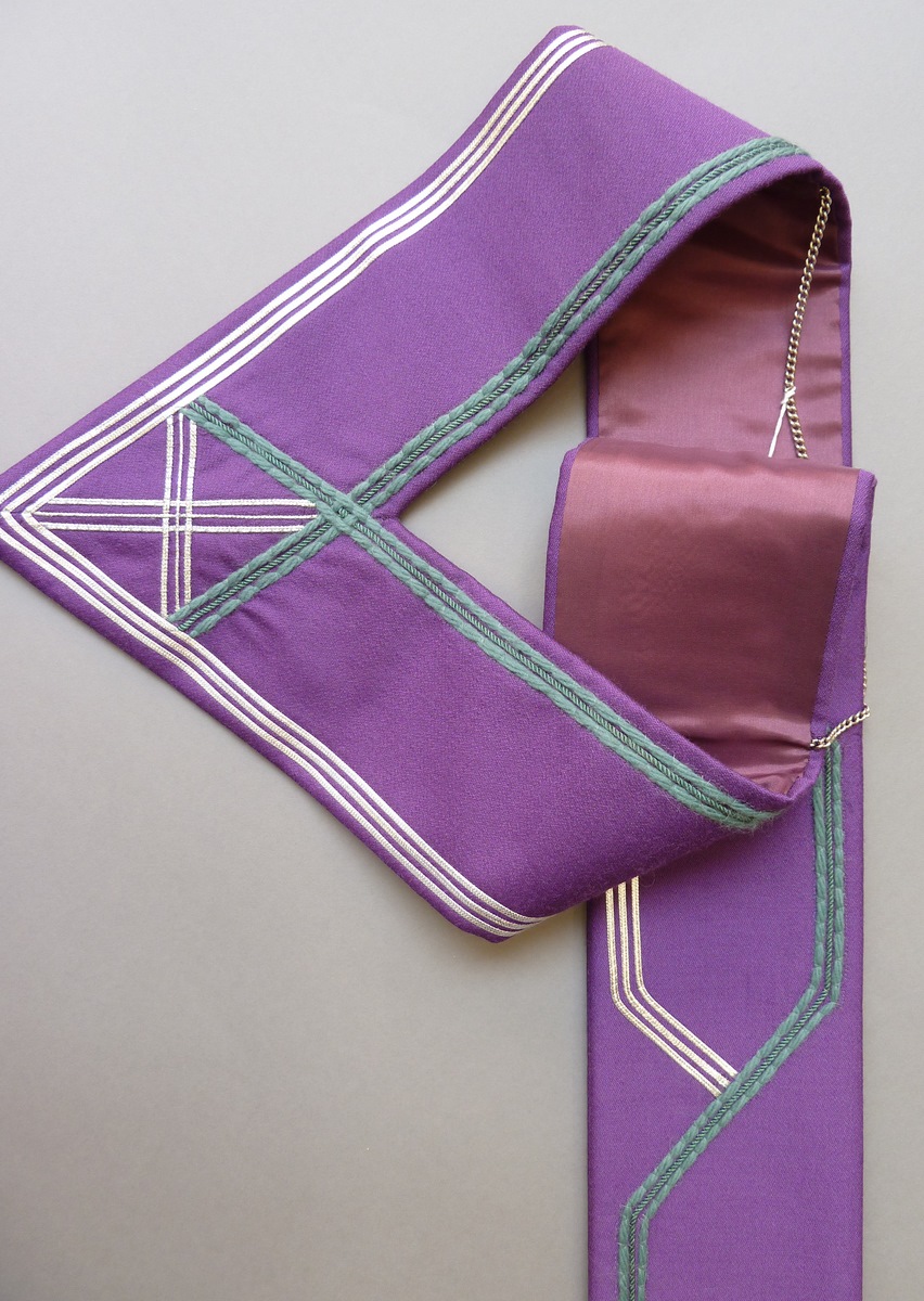 Paarse stola met drie kruisen en versiering in groene draad en zilverdraad
