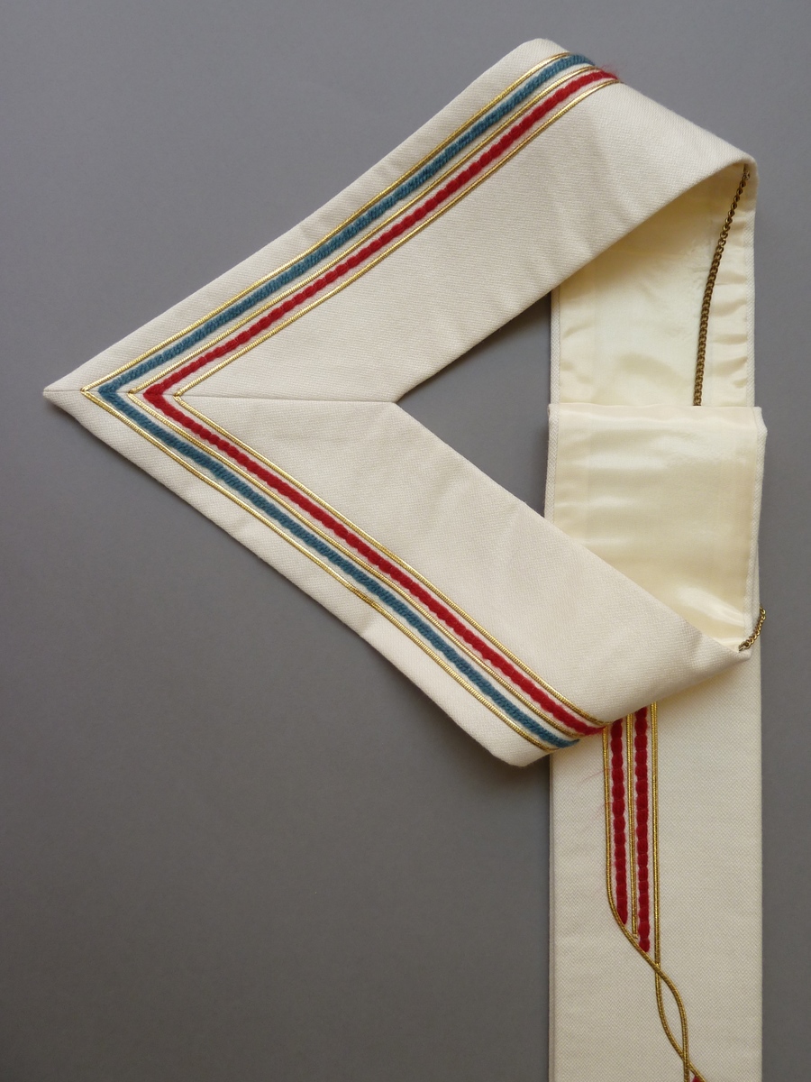 Witte stola met verticale lijnen in rode en blauwe wol en gouddraad