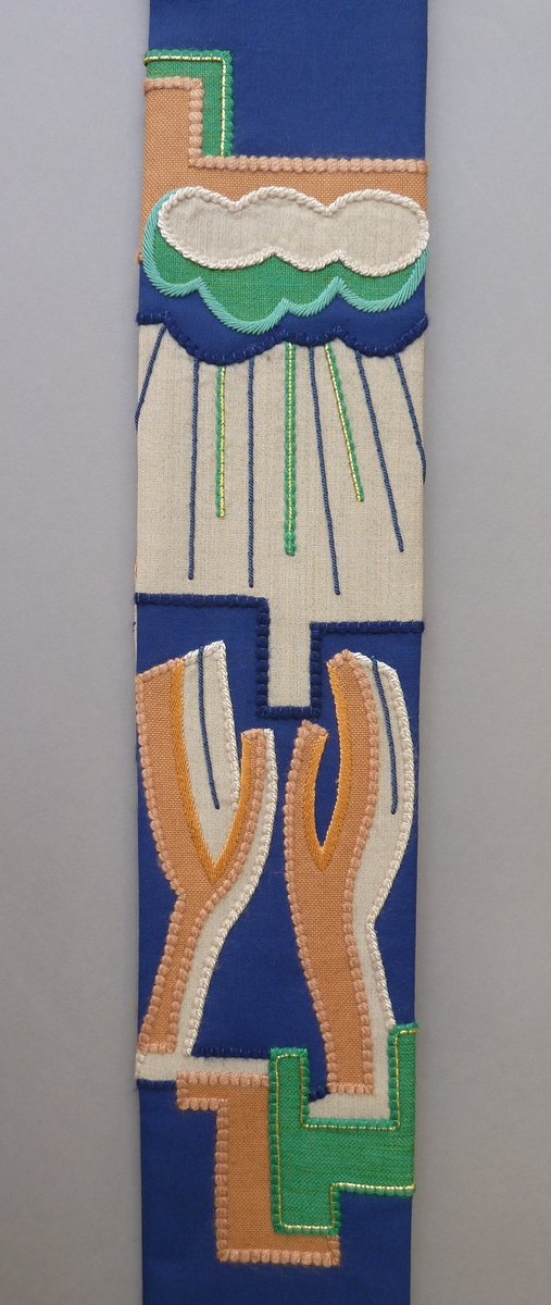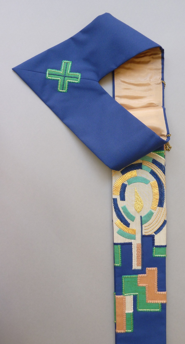 Blauwe stola met kruisje, paaskaars, blokmotief en handen met wolk