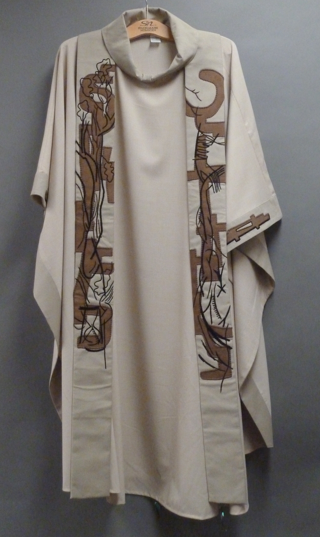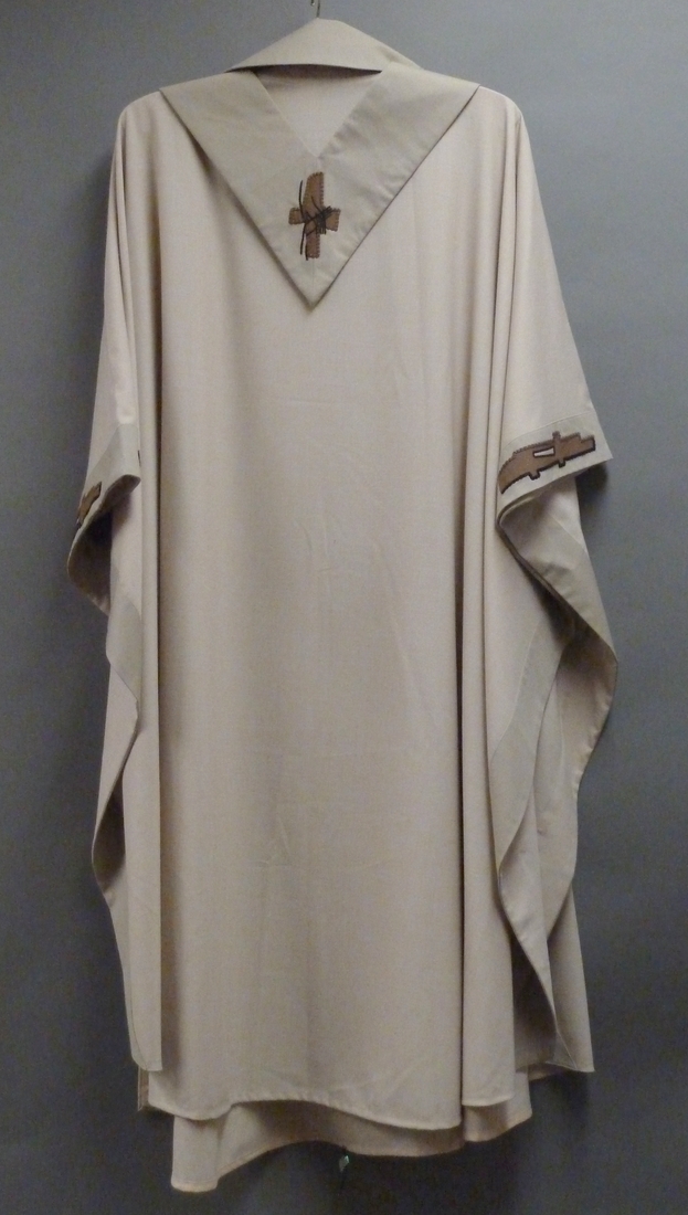 Beige kazuifel met dondere zijbanen waarop geometrische motieven, met omgeslagen kraag