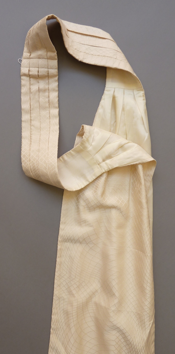 Crème sjaal met ingeweven netmotief, gebruikt bij volwassenendoop