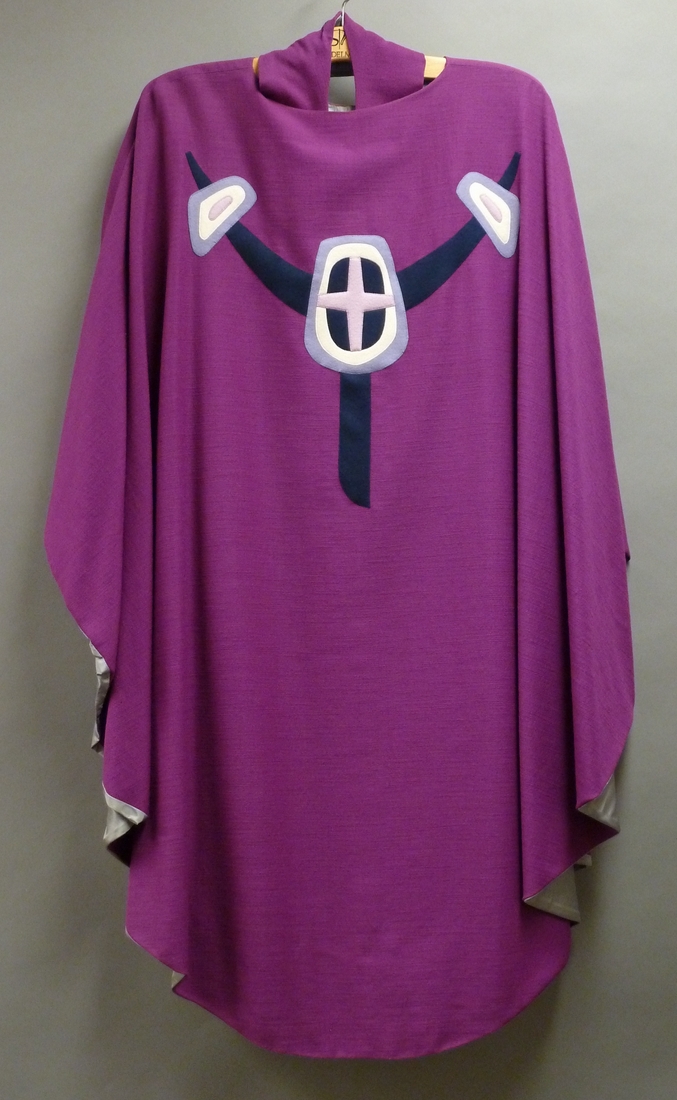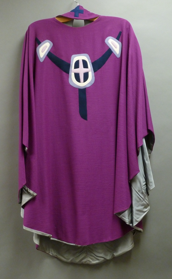Paars kazuifel met applicaties van onder andere een lichtroze kruis