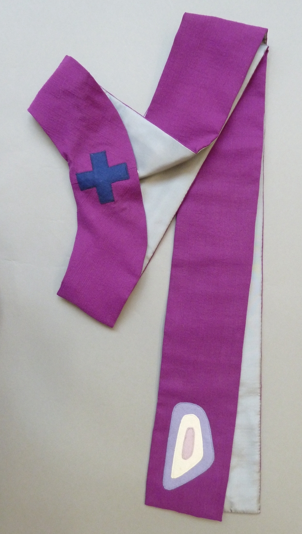 Paarse stola met applicaties van onder andere een donkerblauw kruisje