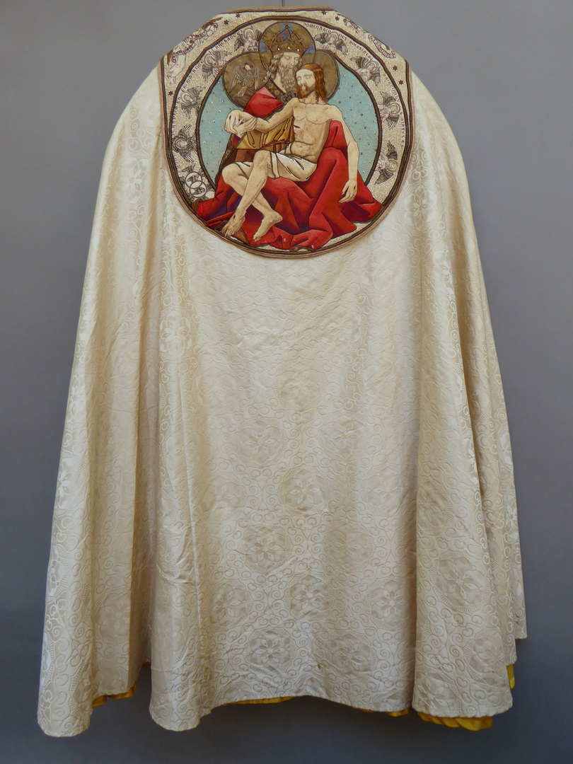 Witte koorkap geborduurd met H. Drie-eenheid als genadestoel op schild. God de Vader met de gestorven Christus op zijn schoot. Naast God de vader de duif van de Heilige Geest. Rond de voorstelling de aartsengelen en serafijnen. In de bovenhoeken de symbolen van de vier evangelisten. Op de aurifriezen florale motieven en schilden met lijdenswerktuigen.