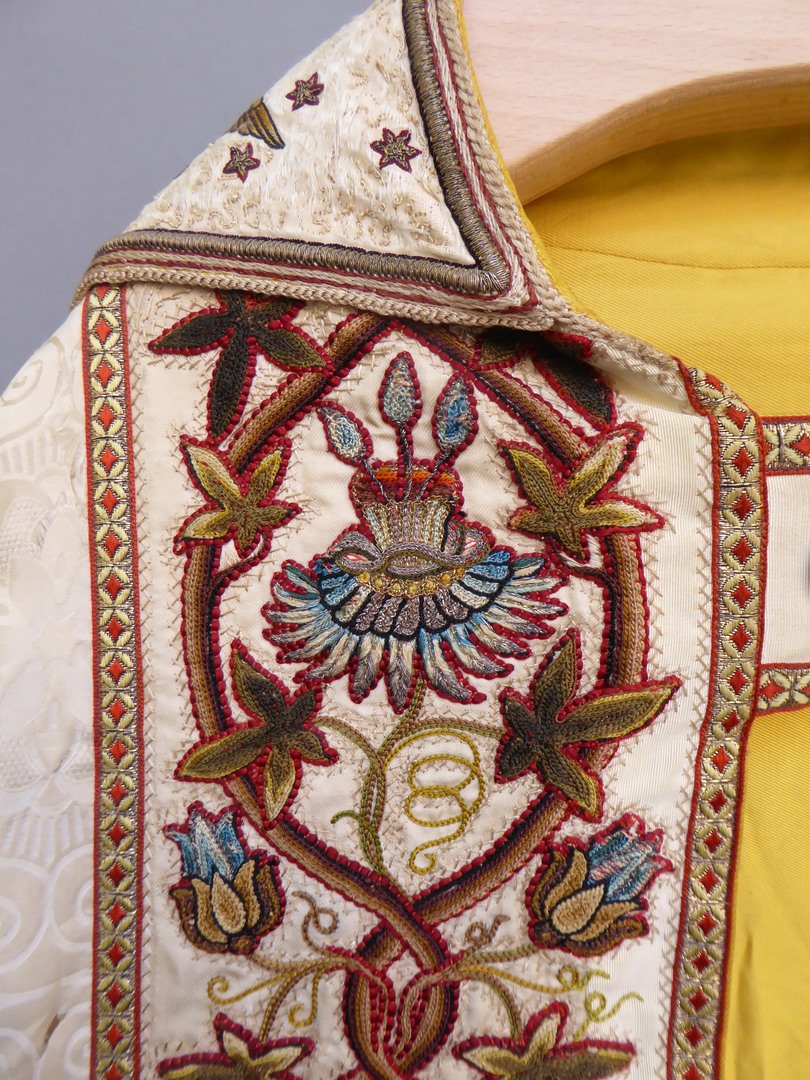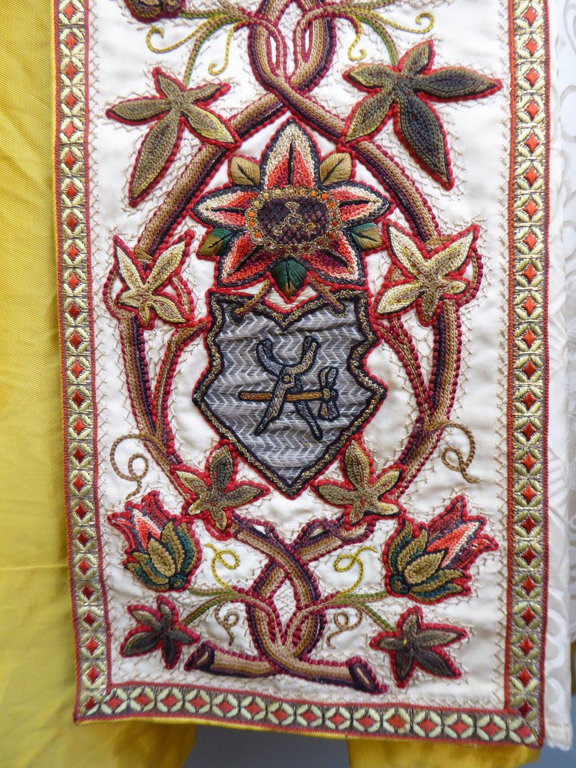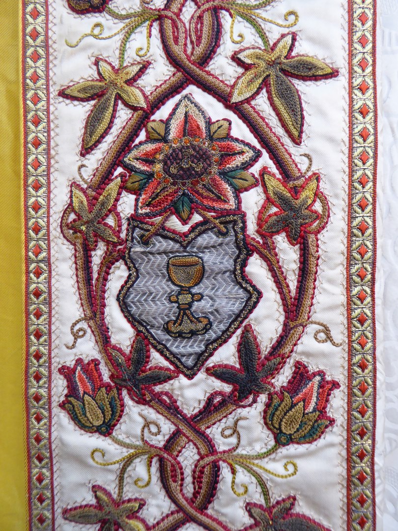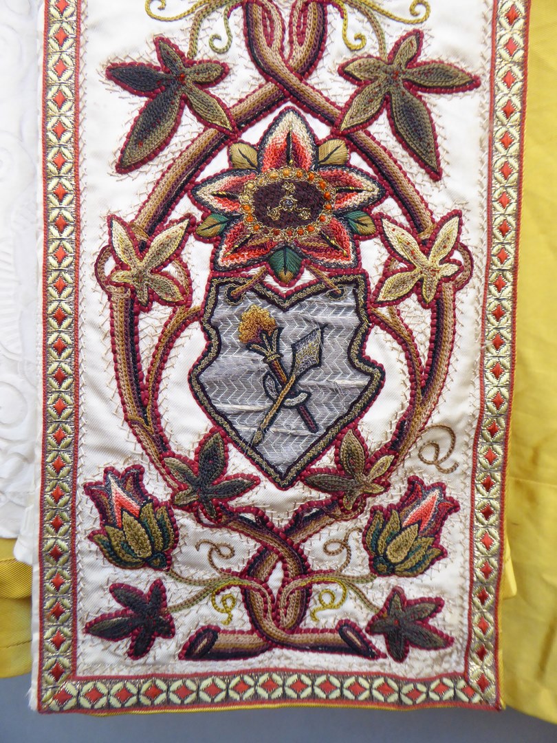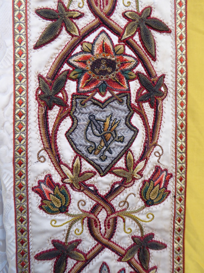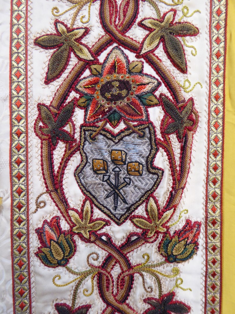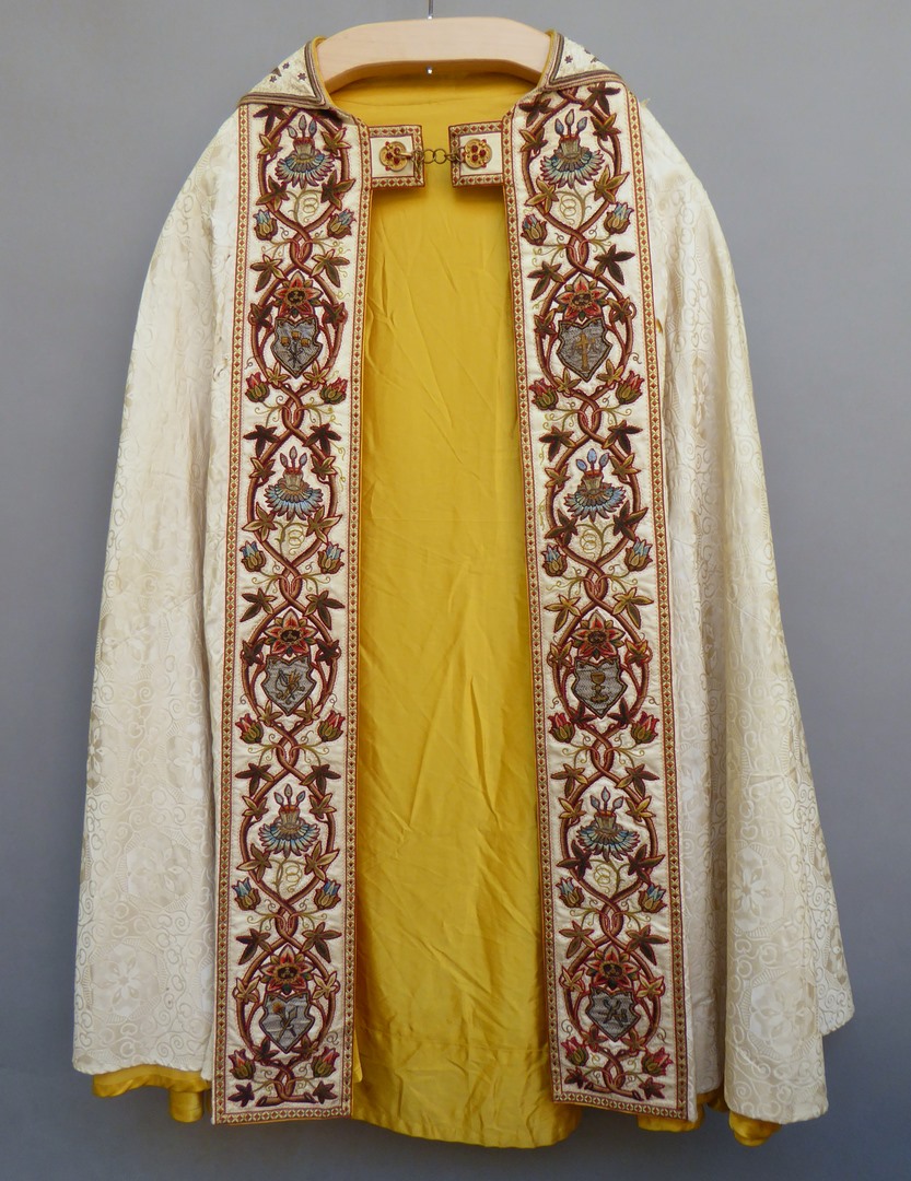 Witte koorkap geborduurd met H. Drie-eenheid als genadestoel op schild en lijdenswerktuigen op aurifriezen