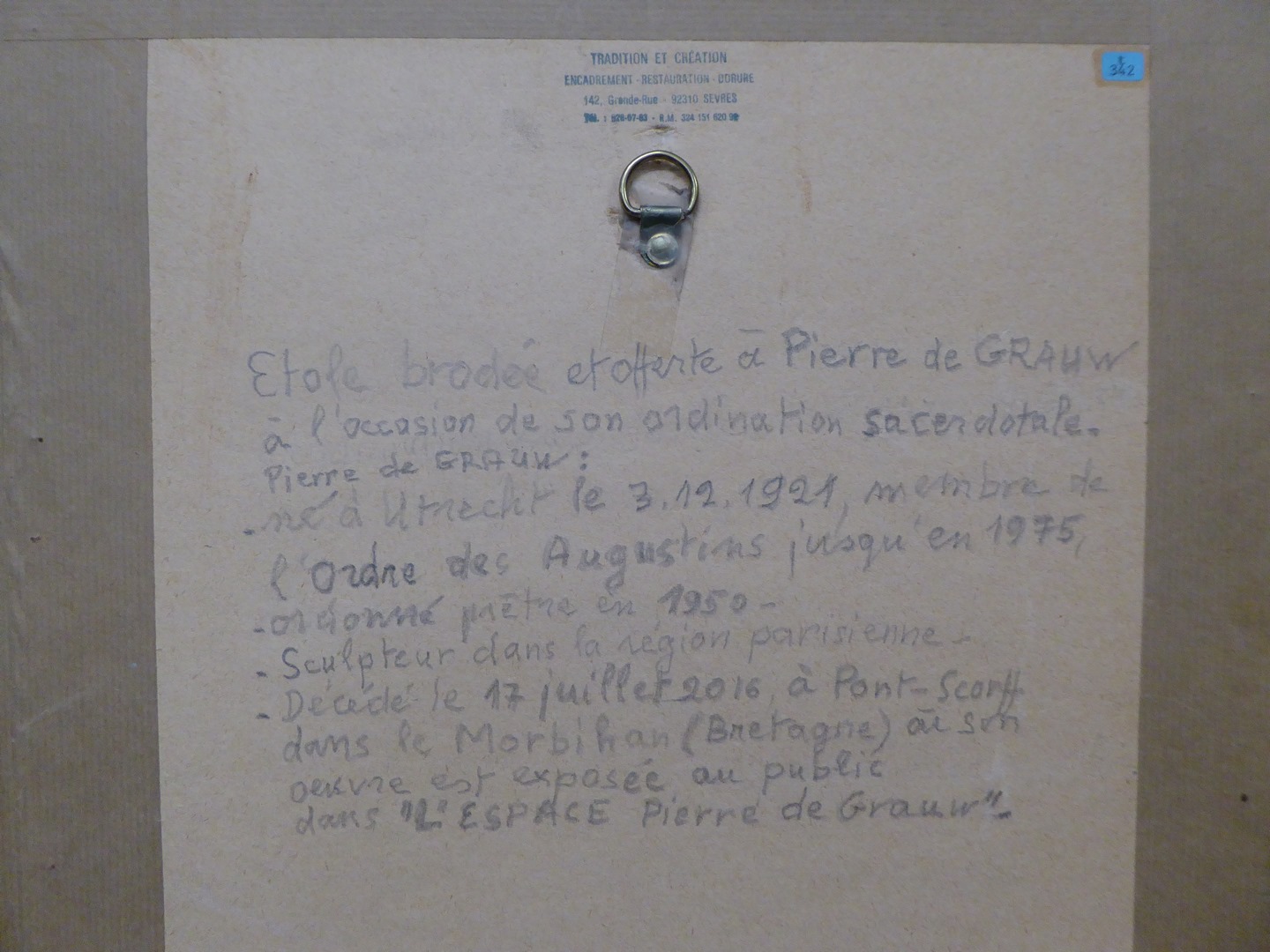 Witte stola met St. Augustinus en St. Monica, aan de uiteinden voorzien van de initialen van de maakster en de datum "10 april 1950". De stola is ingelijst. Op de achterzijde van de lijst heeft de schenkster van het voorwerp en weduwe van Pierre de Grauw een korte levensbeschrijving geschreven.