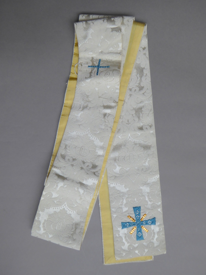 Witte stola met ingeweven granaatappelmotief, met blauwe kruisjes