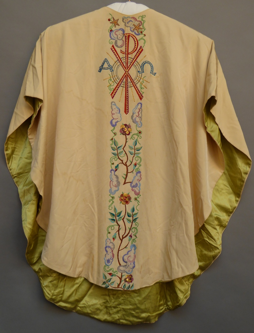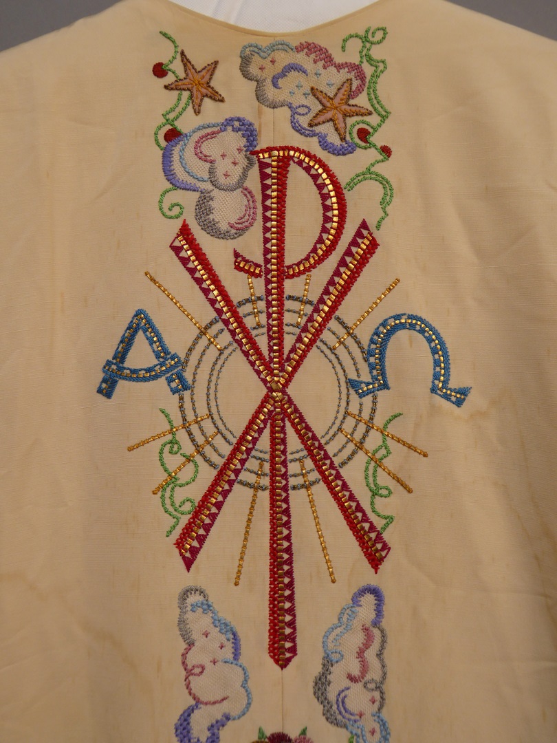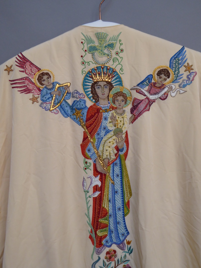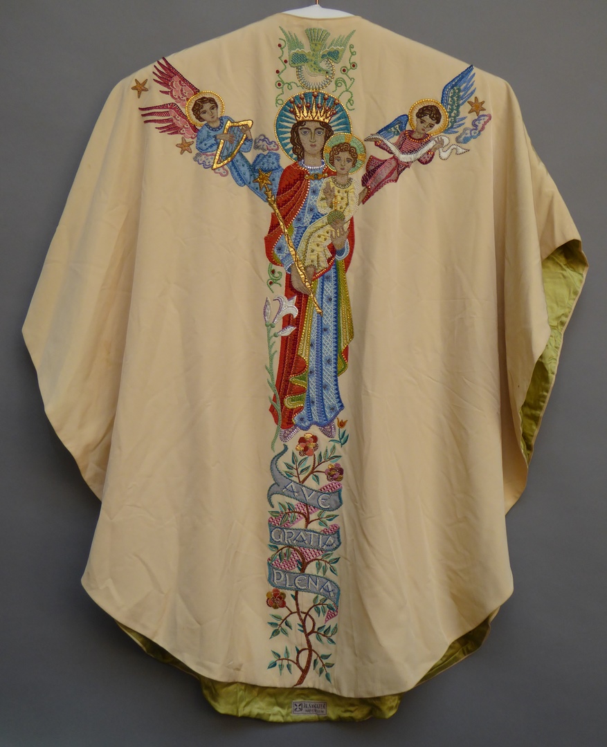 Wit kazuifel met H. Geest, Maria met kind en twee engelen, en met "Ave gratia plena" op achterzijde en met alfa, omega en Christusmonogram op voorzijde