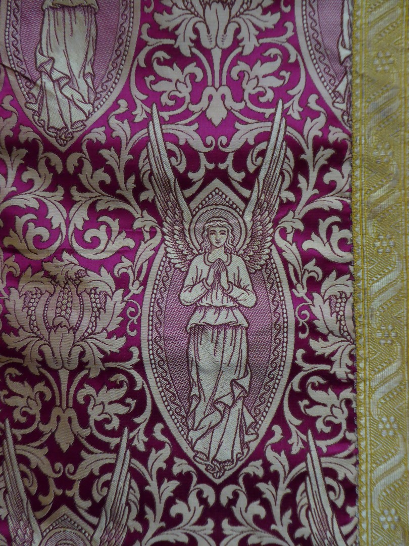 Schoudervelum met ingeweven granaatappelmotieven en frontaal geziene engelen in mandorla