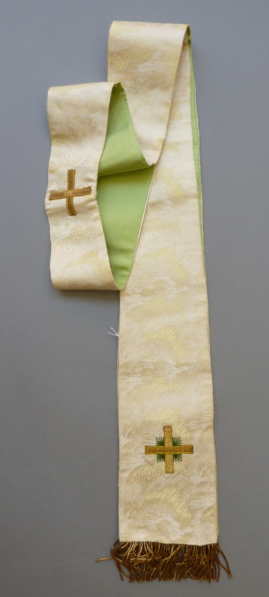 Witte stola met ingeweven wit-geel abstract motief en goudgalon kruisjes met groene stralen