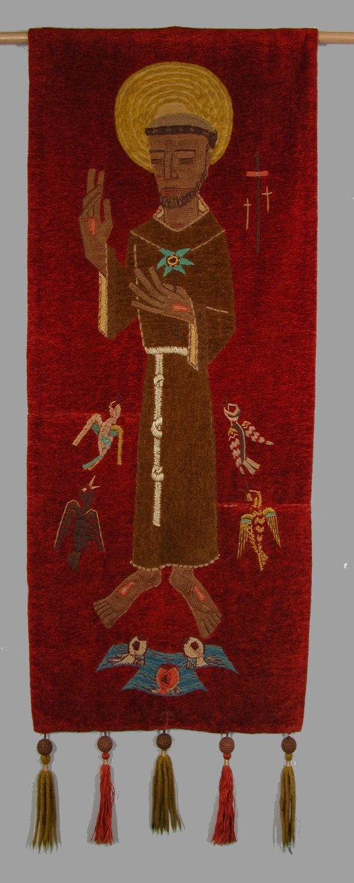 Rood vaandel van Derde Orde van St. Franciscus met H. Franciscus, vogels en vissen, kz. roodbruine achtergond geborduurd met "Derde Orde, Parochie St. Bonifatius Rijswijk, Joanna Wichmann, Leidschegracht 18, Amsterdam"