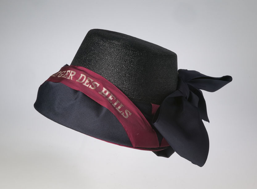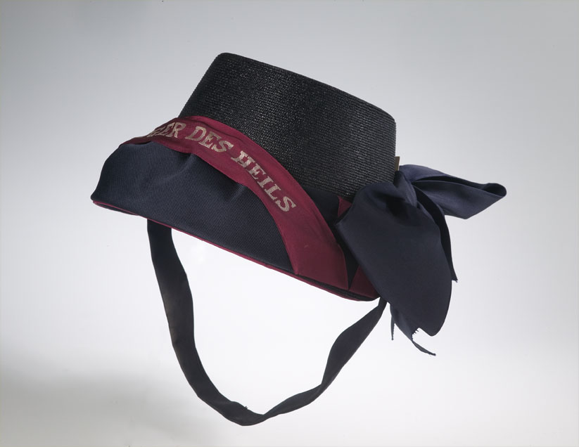 Hoed Leger des Heilssoldate, zwart met rand en rond de hoed blauwe band met platte sierstrik