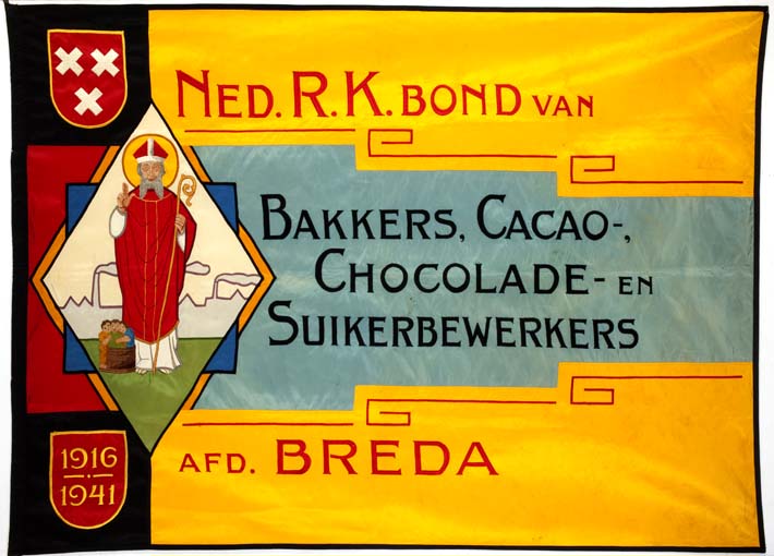 Vlag met St. Nicolaas en kinderen in ton en "Ned. R.K. Bond van ... Suikerbewerkers, afd. Breda"