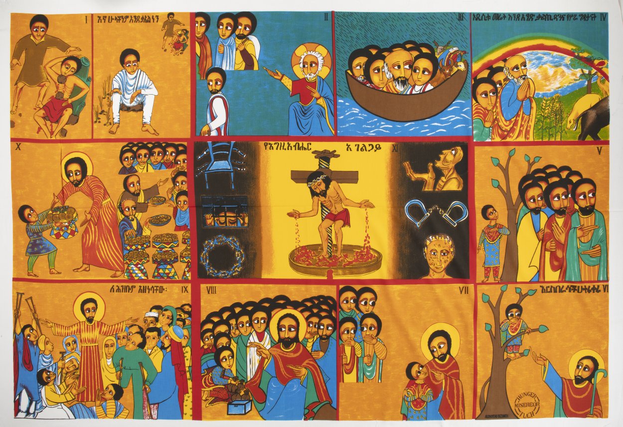 Hongerdoek bedrukt in kleur met o.a. Christus in de mystieke wijnpers en passiewerktuigen