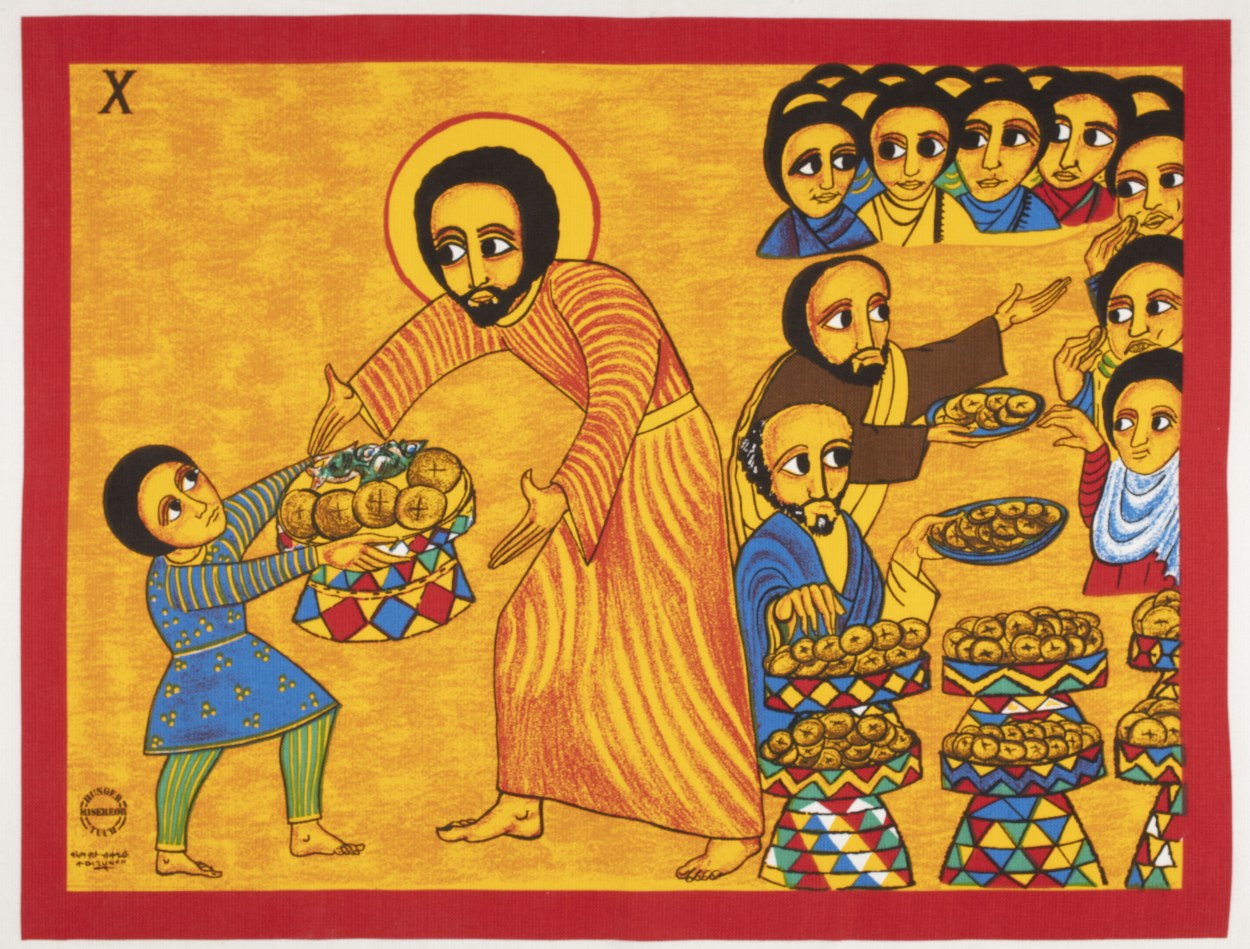 Hongerdoek bedrukt in kleur met wonderbare broodvermenigvuldiging
