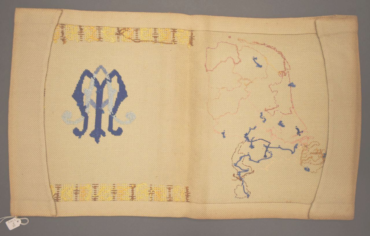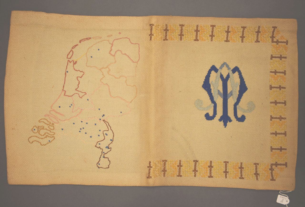 Boekomslag geborduurd met Mariamonogram en kaart van Nederland met Mariabedevaartplaatsen