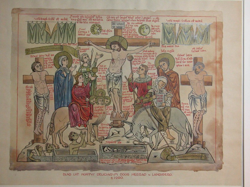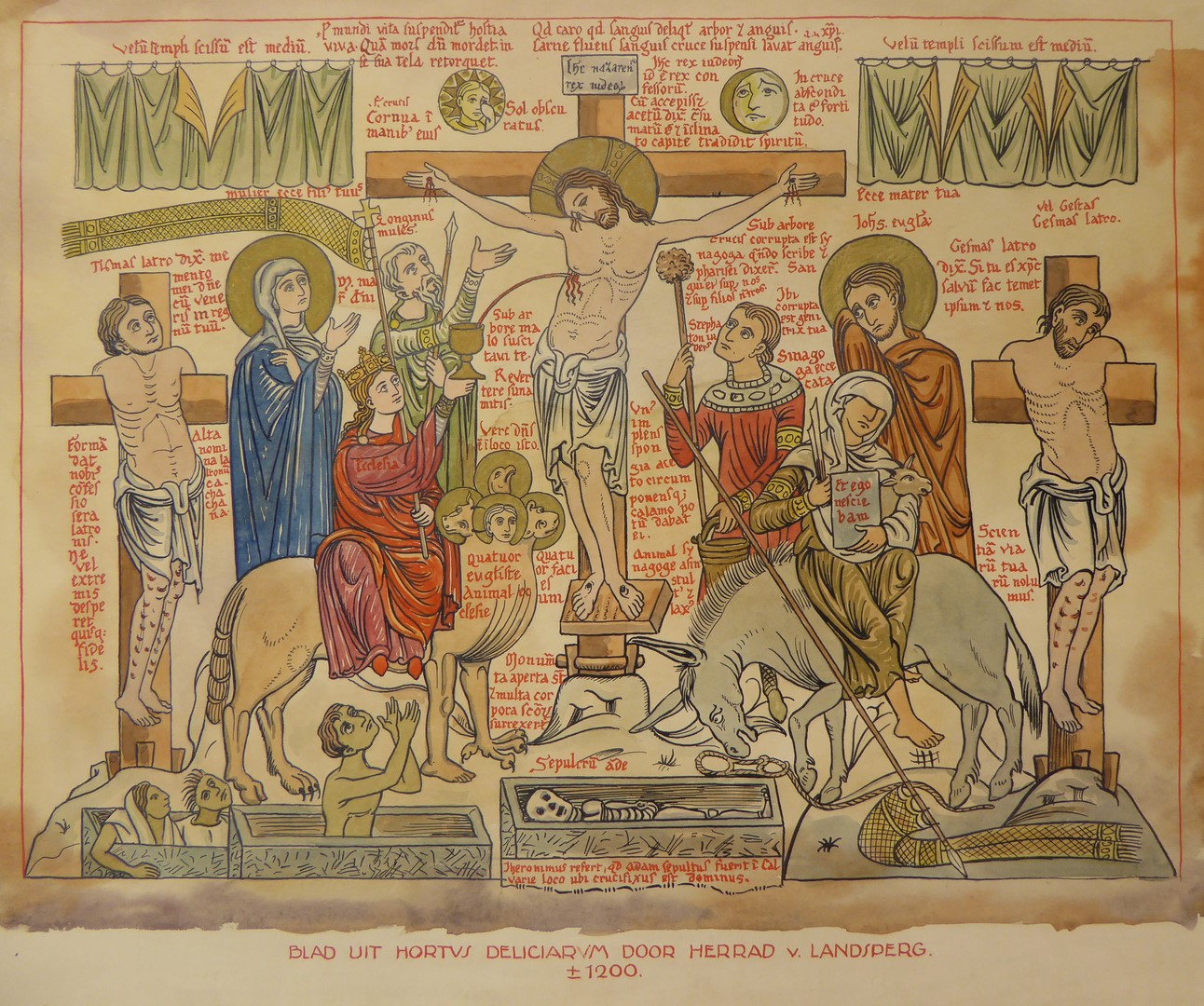 Calvarie uit de Hortus Deliciarium van Herrad van Landsberg, naar origineel uit ca. 1200