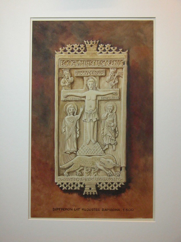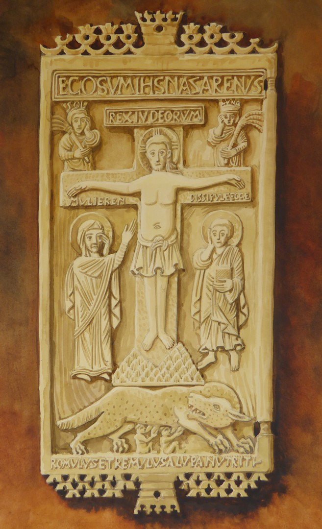 Calvarie en Romulus en Remus naar ivoren tweeluik (klooster Rambona), naar origineel uit ca. 600