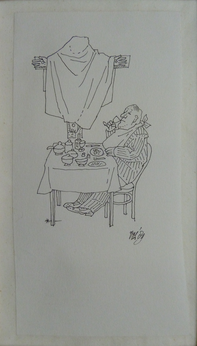 Ontwerp illustratie Vrij Nederland tafelende heer in refter Catharijneconvent met crucifix