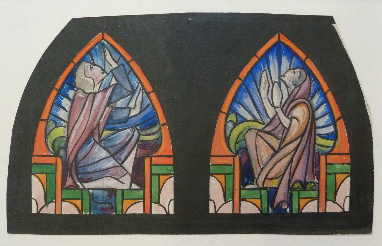 Ontwerptekening glas-in-loodraam Vrij Kath. Kerk te Soerabaja(?) met twee figuren handen omhoog