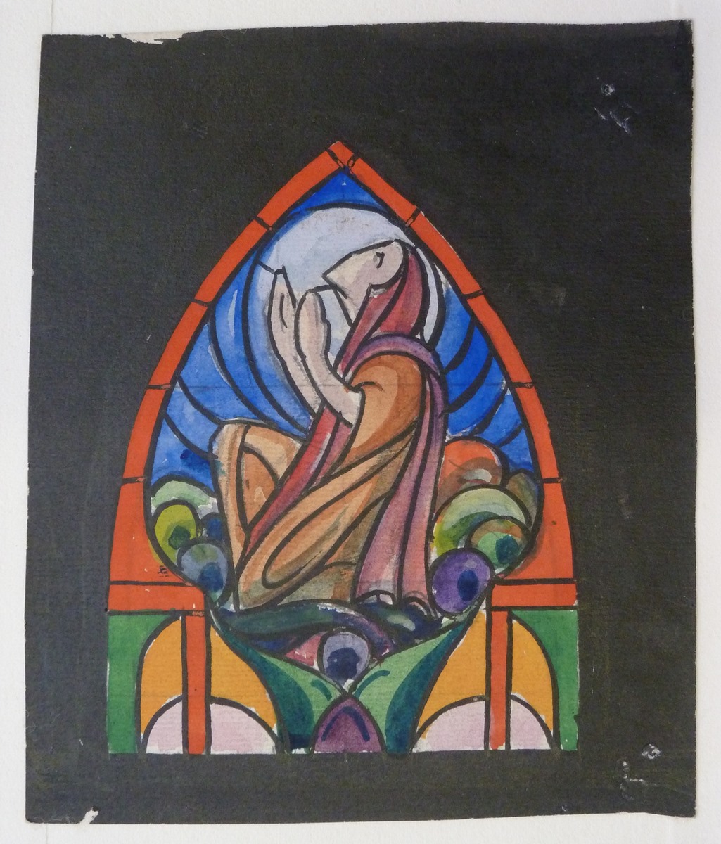 Ontwerptekening glas-in-loodraam Vrij Kath. Kerk te Soerabaja(?) met figuur met geheven handen