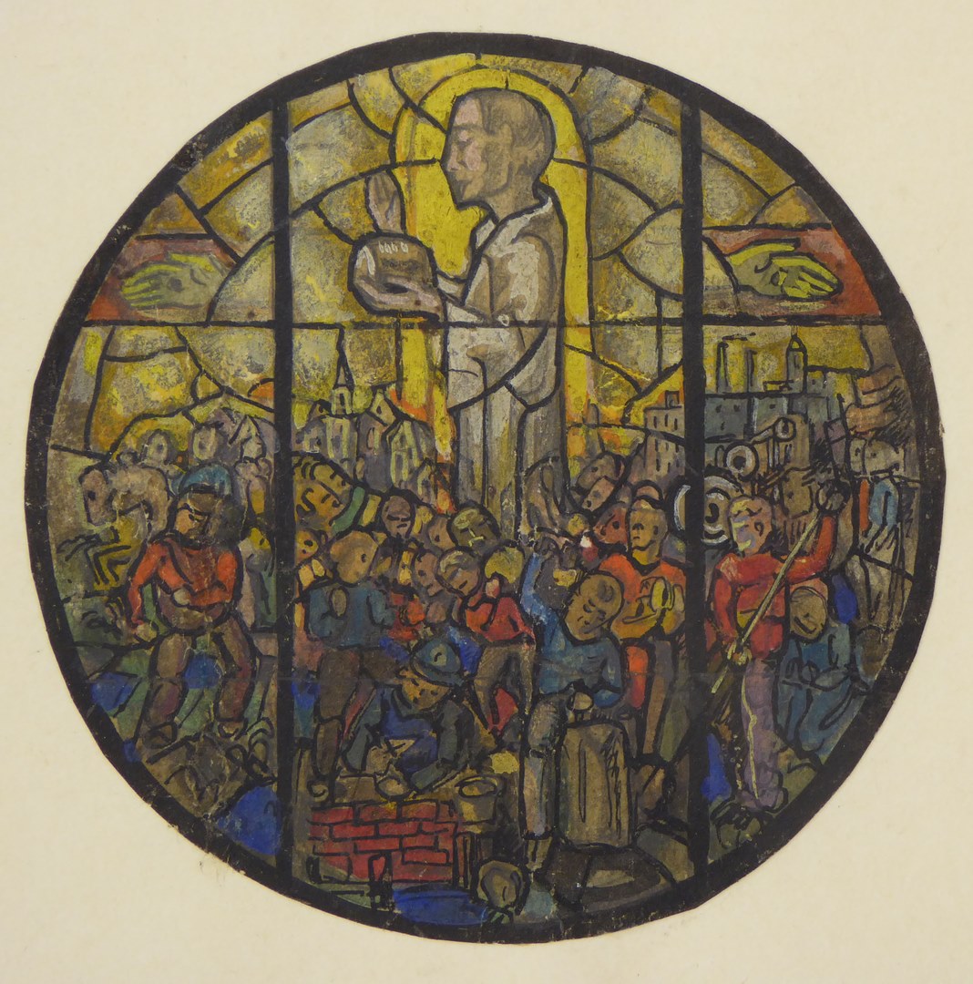 Ontwerptekening glas-in-loodraam Woodbrokers-gemeenschap te Bentveld met man en vrouw met fakkel
