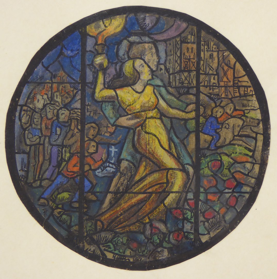 Ontwerptekening glas-in-loodraam Woodbrokers-gemeenschap te Bentveld met werkende mensen, Jezus