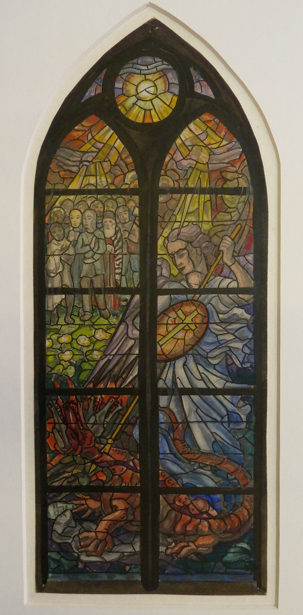 Ontwerptekening glas-in-loodraam Leeuwenberghkerk te Utrecht met Michaël en de draak