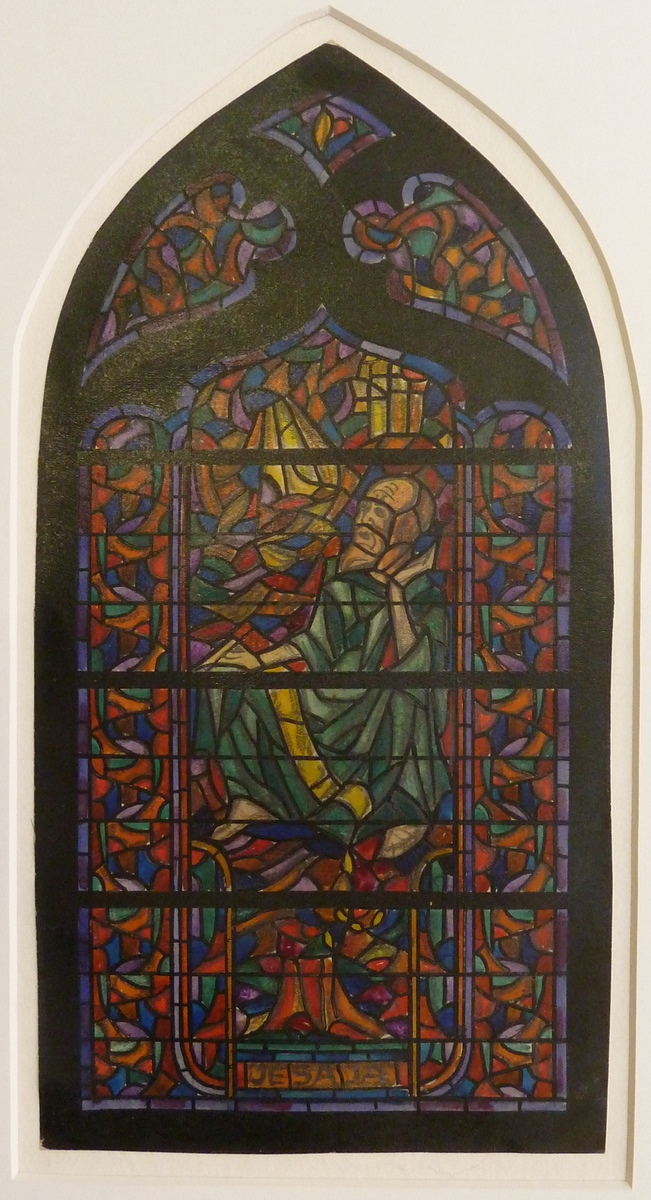 Ontwerptekening glas-in-loodraam met Jesaja, boomstronk waaruit takje groeit en "Jesaja"
