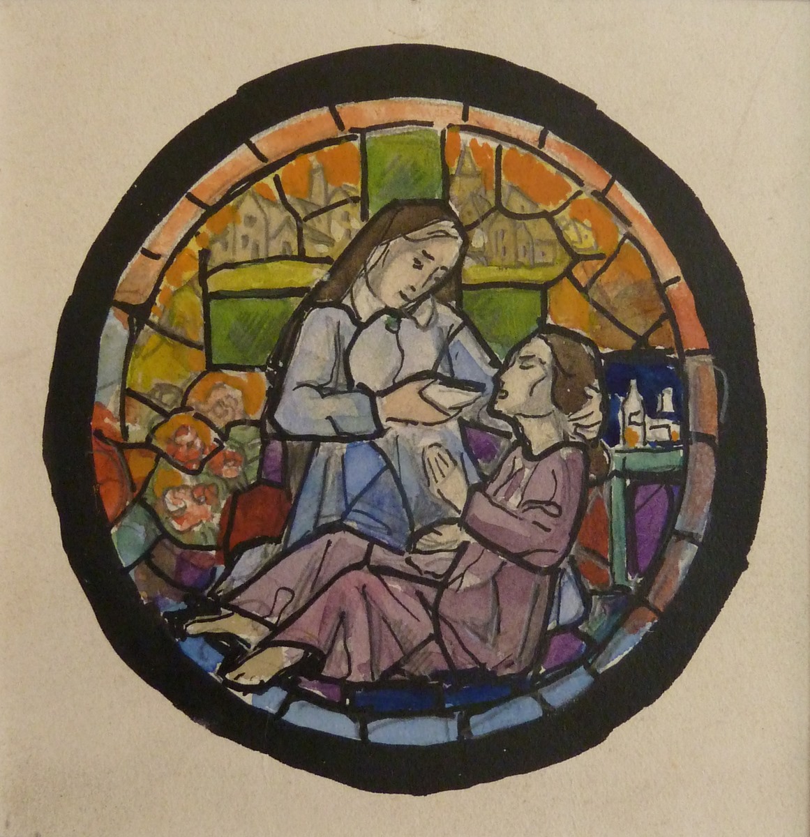Ontwerptekening glas-in-loodraam met vrouw met sluier die iemand te drinken geeft