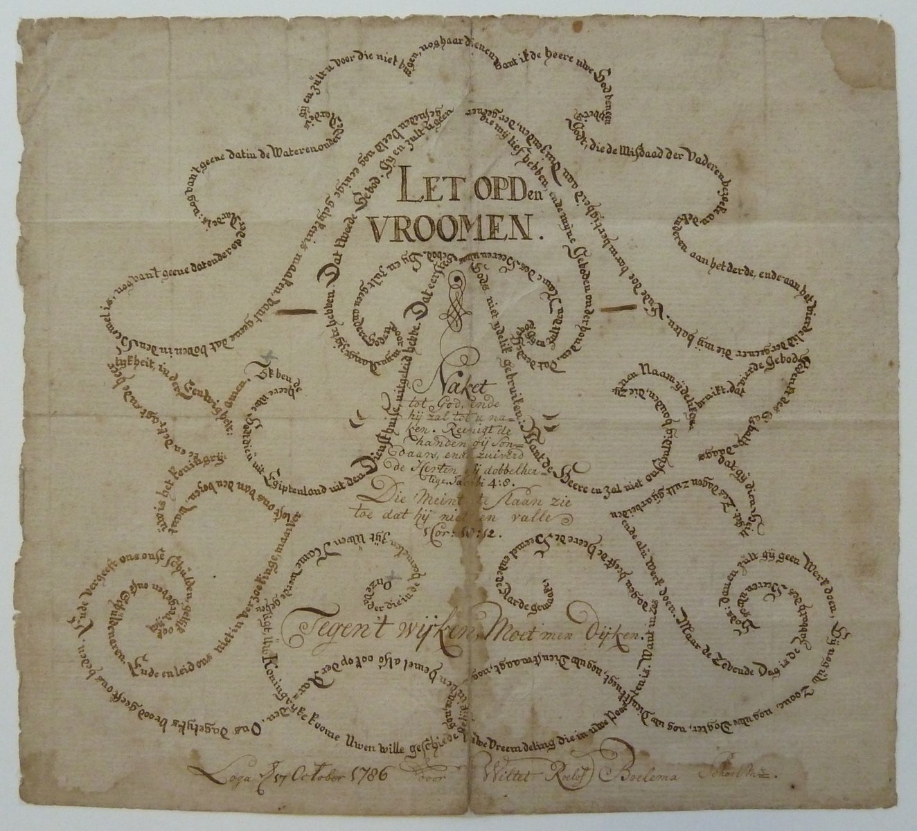 Kalligrafie met "Let op den vromen", "Naket tot God, ende hij zal tot u naken. Reinigt ..."