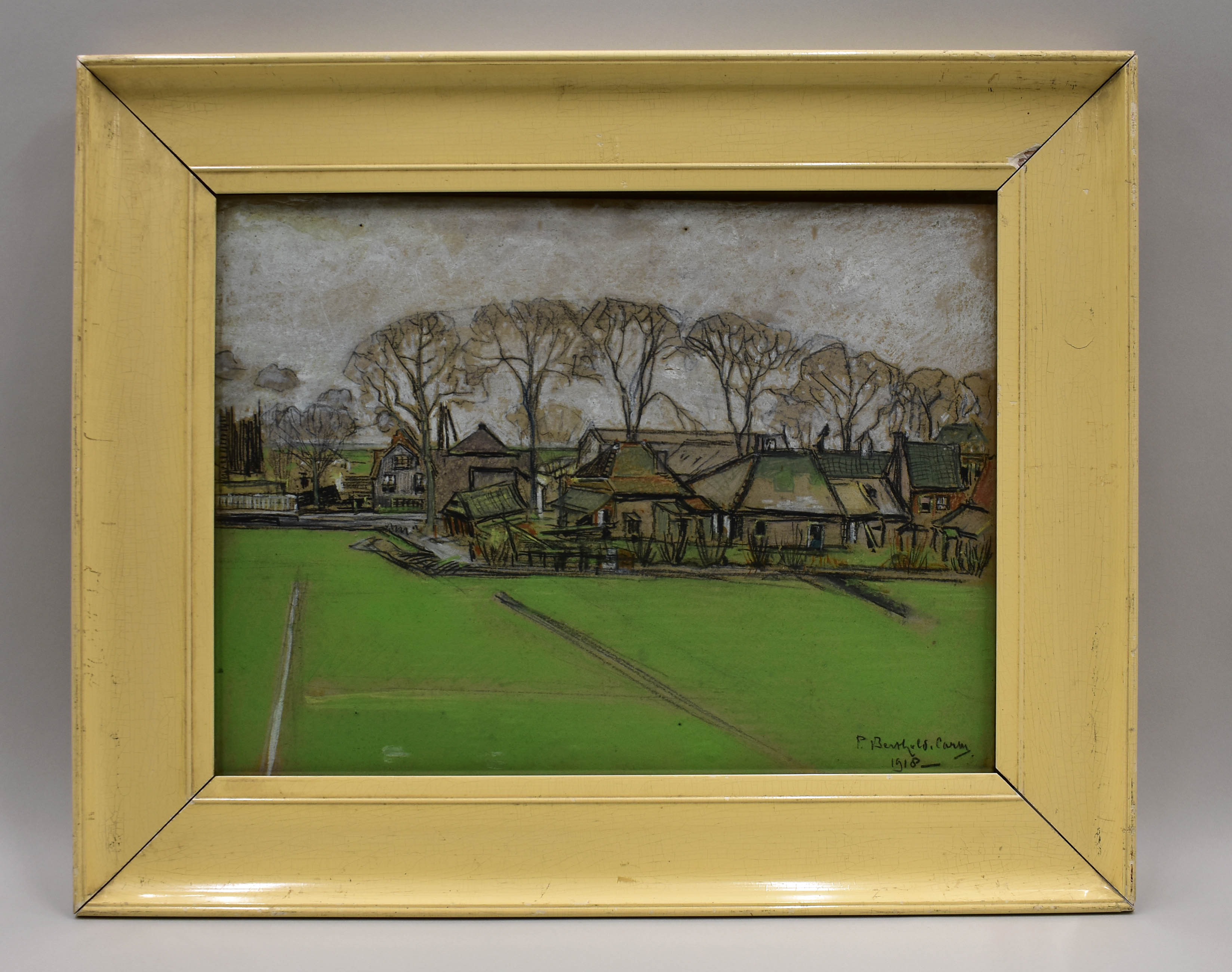 Pasteltekening van boerendorp temidden van weilanden