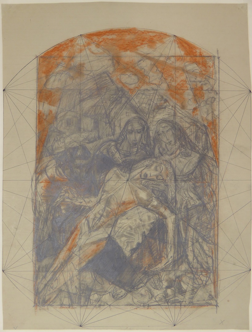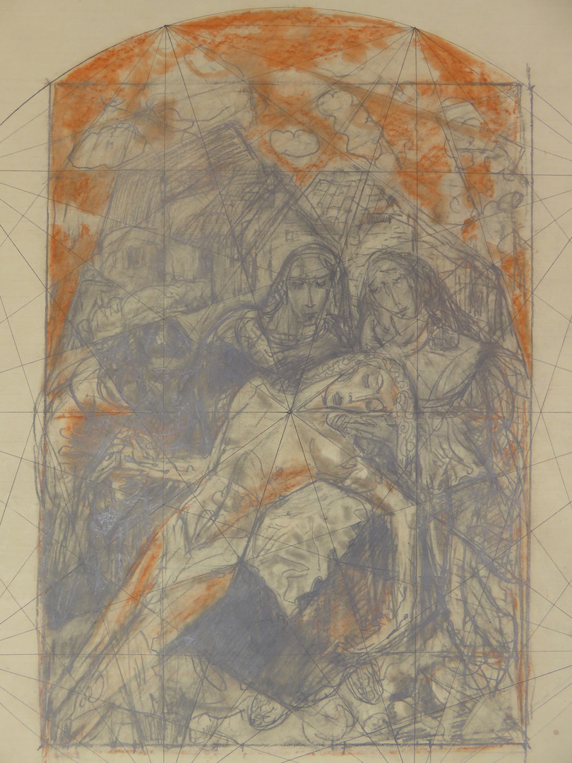 Centraal is, in een halfzittende houding, de dode Christus afgebeeld. Christus heeft halflang haar en is baardloos. Hij draagt een lendendoek. Links op de tekening houdt Johannes de rechterhand van Christus vast. De twee Maria's, voorzien van een sluier, buigen zich over het dode lichaam. Op de achtergrond is een vage aanduiding van het kruis ...