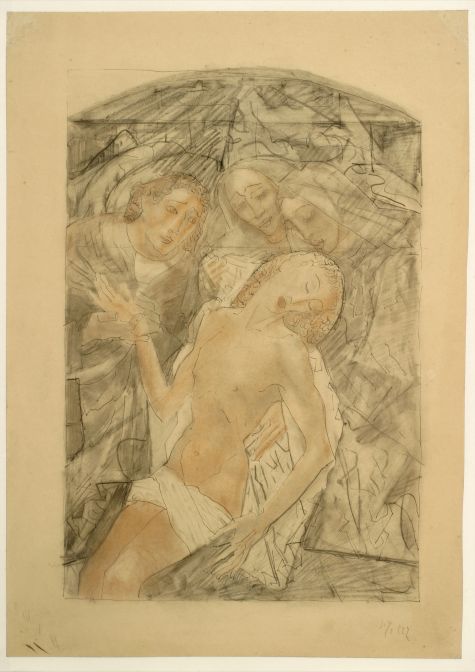 Centraal is het dode lichaam van Christus afgebeeld. Aan zijn rechterzijde houdt Johannes zijn rechterhand vast. De twee Maria's ondersteunen het lichaam. Op de achtergrond zijn enkele gebouwen en een wolkenlucht te zien. De tekening is verdeeld in een groot aantal vlakken. Vanuit de hals van Christus wordt de voorstelling door middel van tien radiale ...