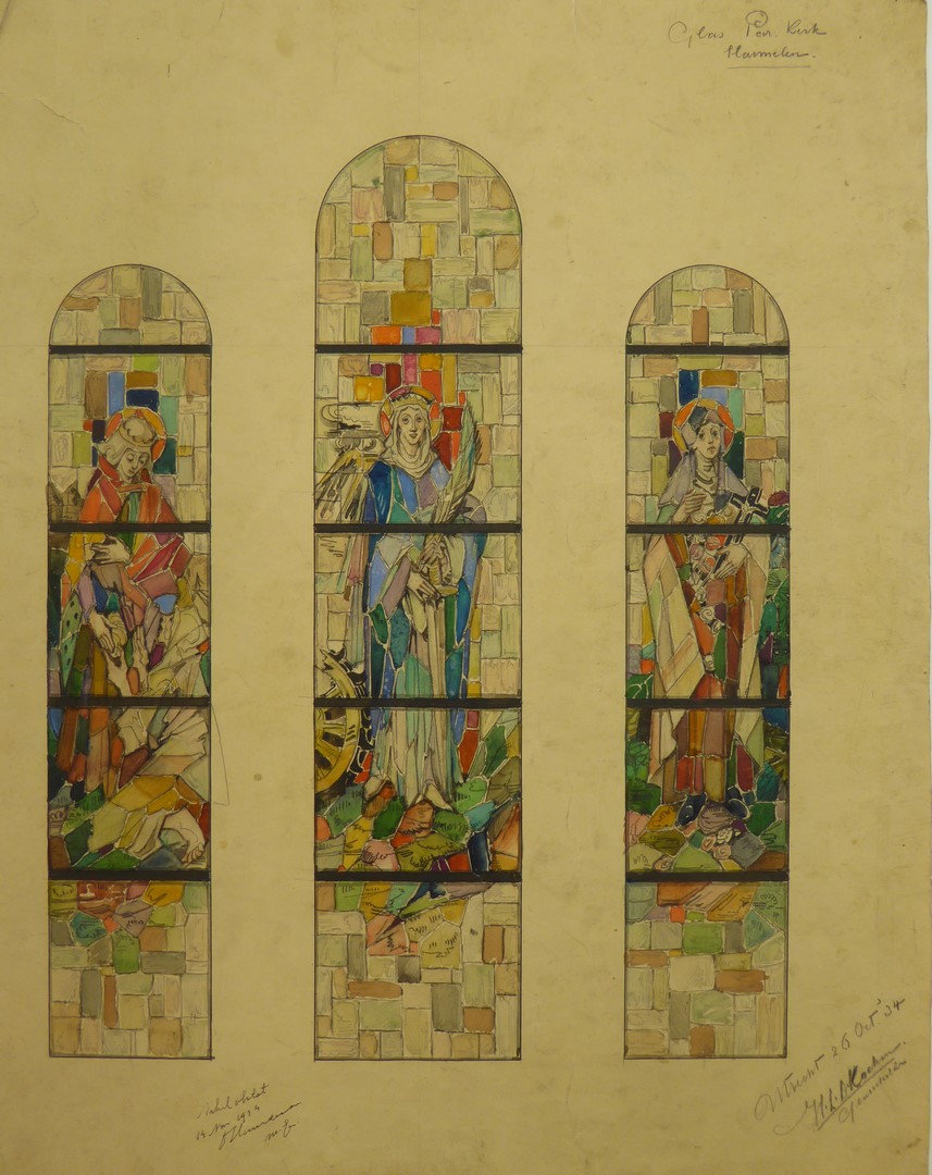 Ontwerp drie glasramen met Elisabeth van Thüringen, Catharina van Alexandrië en Theresia van Lisieux (Harmelen, St. Bavokerk)