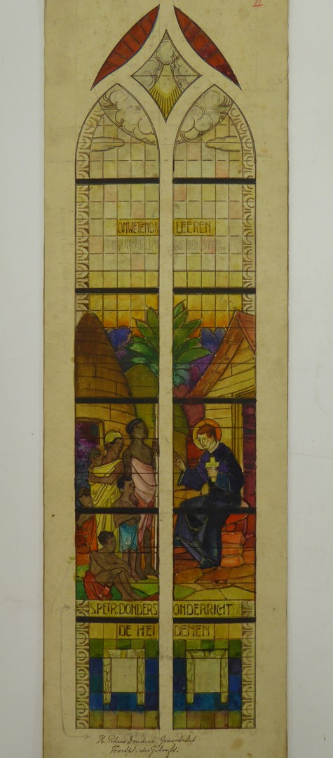 Ontwerp glasraam met Petrus Donders die Surinamers toespreekt met "S. Petr:Donders onderricht de heidenen" (Herwen)