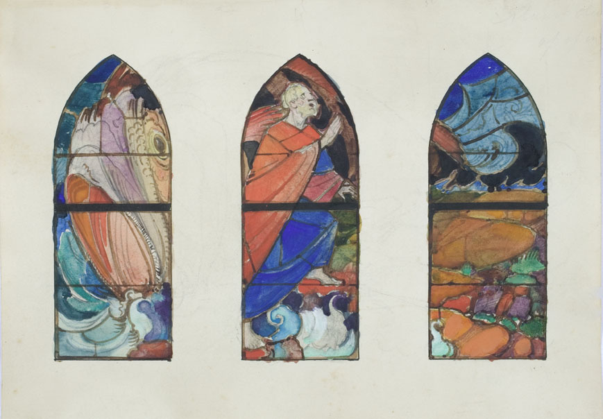 Ontwerp drie glasramen met Jonas en de walvis (Maarn, St. Theresiakerk)