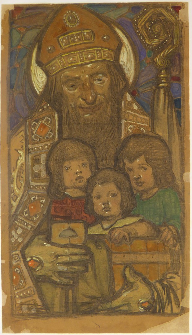 Ontwerp glasraam met St. Nicolaas met drie kinderen in de tobbe