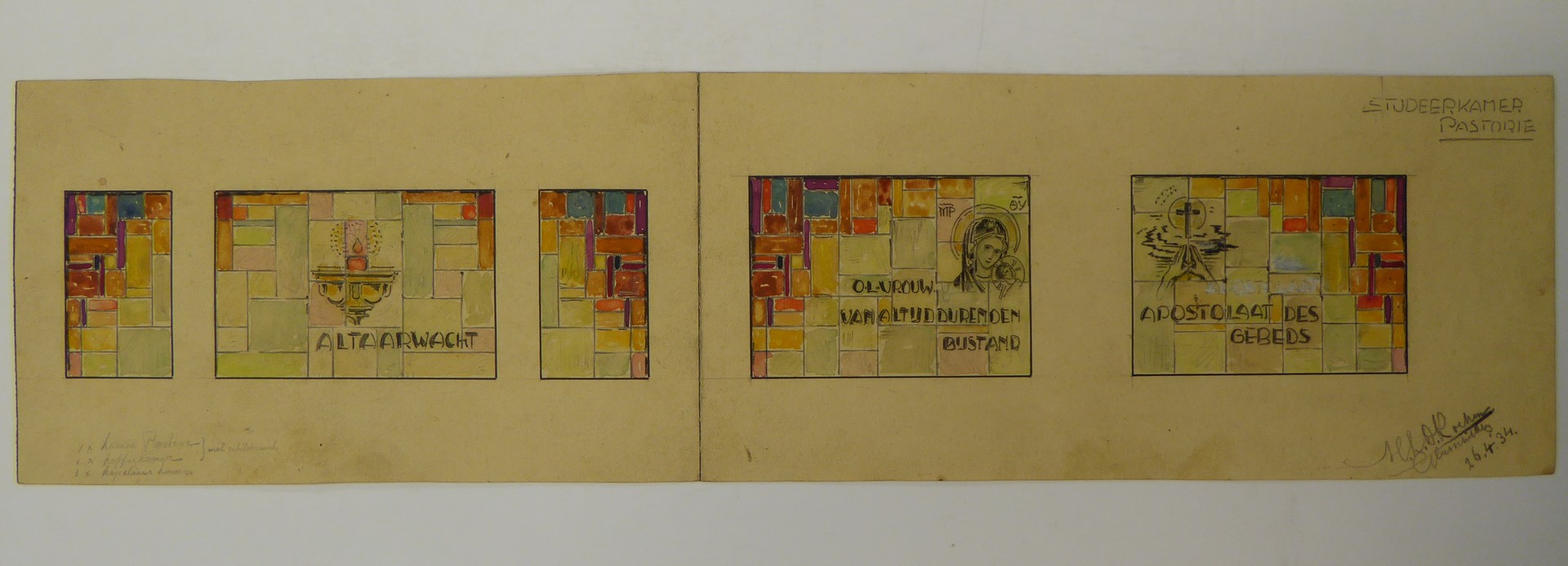 Ontwerp vijf glasramen met kaars en "altaarwacht", Maria met kind en "O.L. Vrouw van Altijddurende bijstand", handen waarboven kruis en "Apostolaat des Gebeds", met "studeerkamer pastorie"